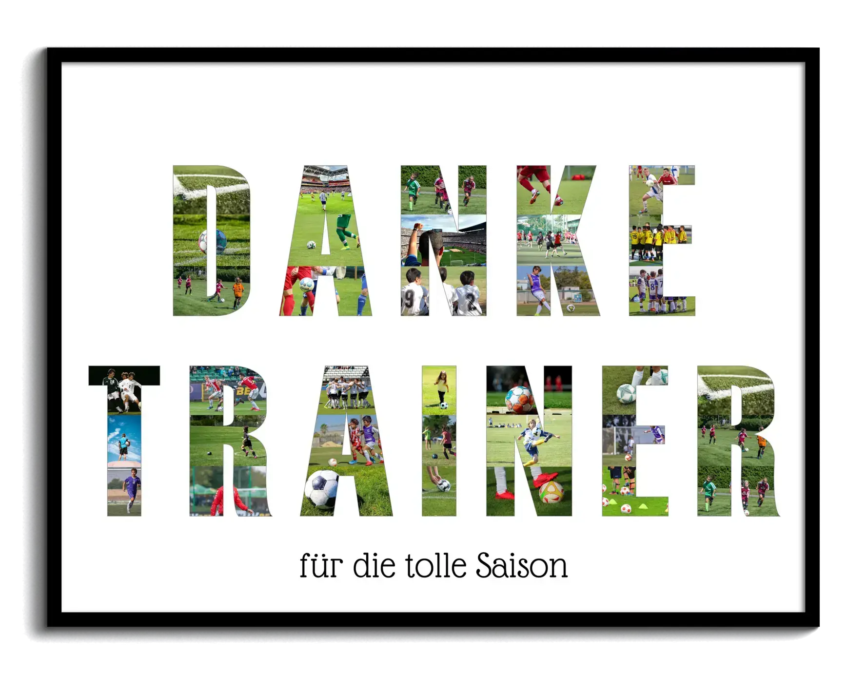 Gestalte jetzt Deine eigene personalisierte Fotocollage und zeige Deinem Trainer, wie sehr Du seine Arbeit schätzt. Mit unserer einzigartigen Collage, die die Worte "DANKE TRAINER" aus Fotos bildet, kannst Du wundervolle Momente der letzten Saison festhalten. Eine individuelle Widmung, wie "...für die tolle Saison", verleiht dem Geschenk eine besondere Note. Die Fotos können von Trainingseinheiten oder Spielen stammen und die Teilnehmer bei ihrer Leidenschaft im Einsatz zeigen.