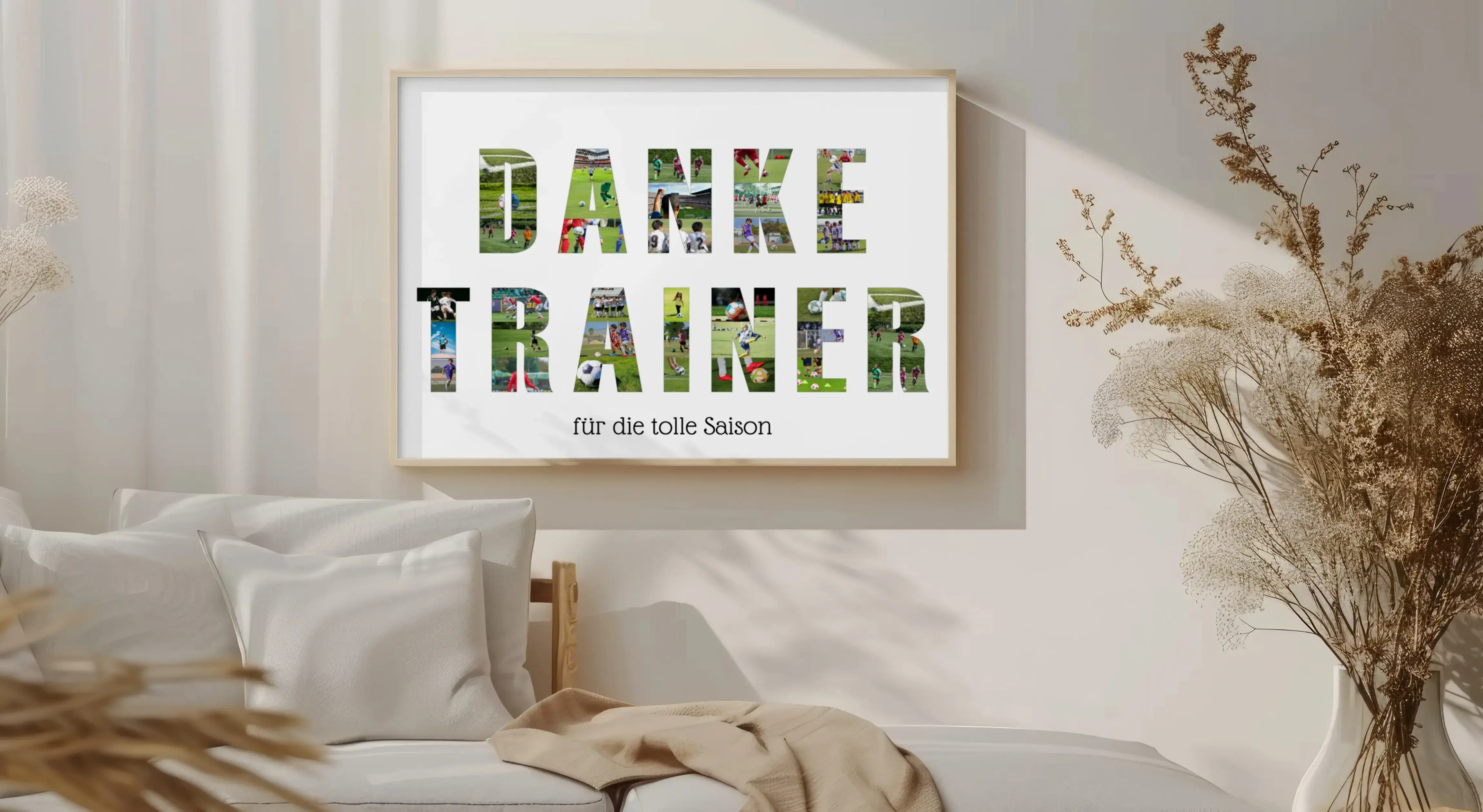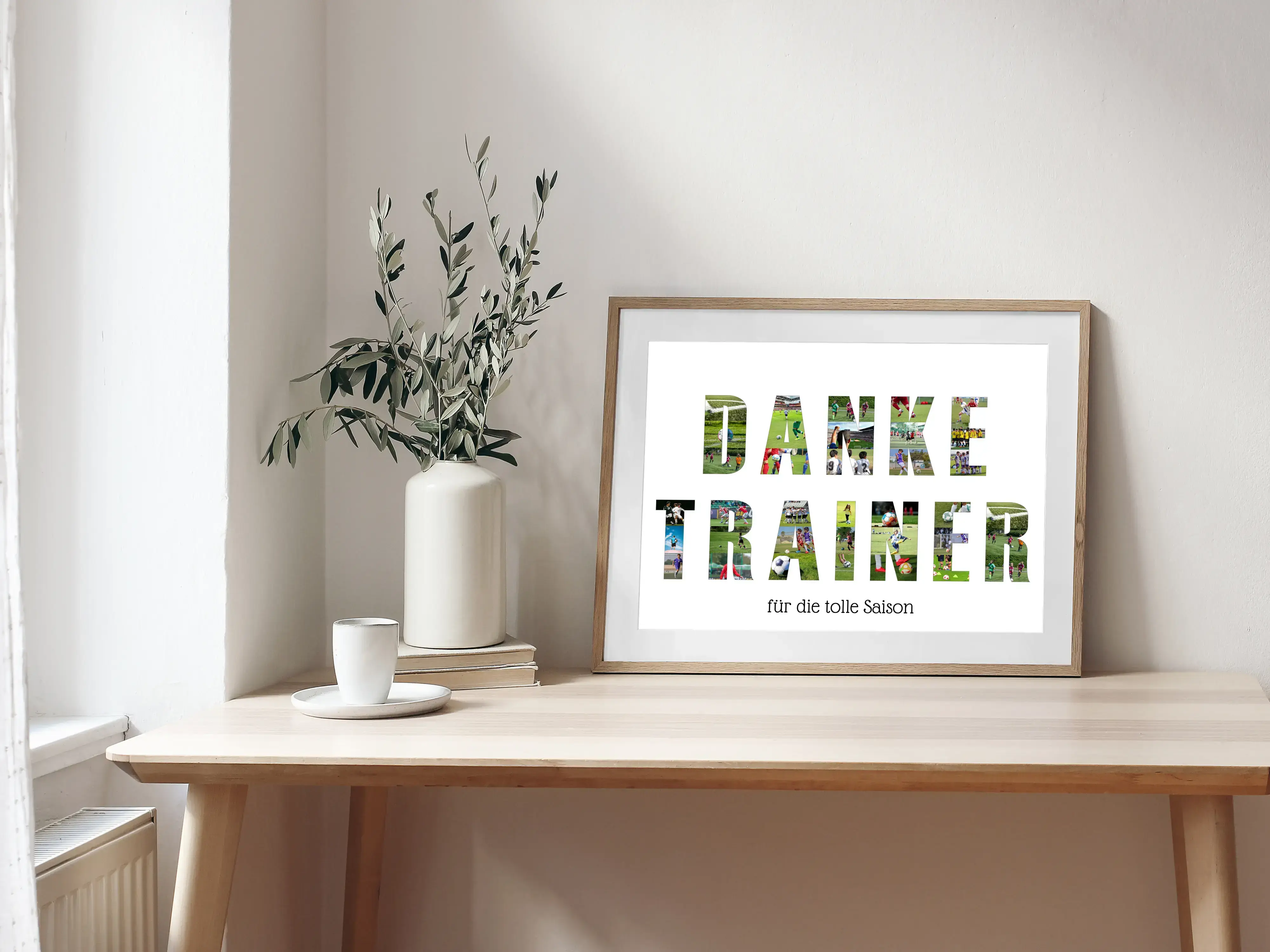 Gestalte jetzt Deine eigene personalisierte Fotocollage und zeige Deinem Trainer, wie sehr Du seine Arbeit schätzt. Mit unserer einzigartigen Collage, die die Worte "DANKE TRAINER" aus Fotos bildet, kannst Du wundervolle Momente der letzten Saison festhalten. Eine individuelle Widmung, wie "...für die tolle Saison", verleiht dem Geschenk eine besondere Note. Die Fotos können von Trainingseinheiten oder Spielen stammen und die Teilnehmer bei ihrer Leidenschaft im Einsatz zeigen.