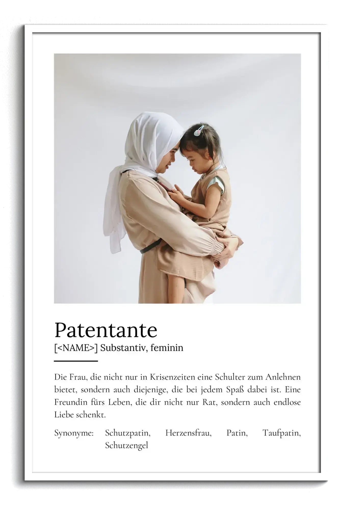 Gestalte jetzt dein einzigartiges Patentante-Definitionsposter im Duden-Stil! Ein wunderbares Geschenk, das zeigt, wie wichtig dir deine Patentante ist. Füge ein eigenes Foto hinzu und personalisiere den Definitionstext für einen ganz besonderen Touch.