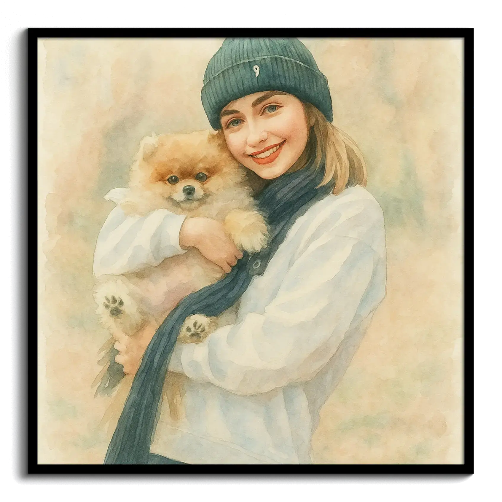 Jetzt dein Foto mit KI umwandeln, gestalten und als Kunstdruck sofort bestellen. Im Beispiel siehst du ein Aquarell: Ein Originalfoto wurde per KI in eine zarte Wasserfarben‑Illustration verwandelt, mit weichen Pinselverläufen, feiner Papierstruktur und harmonischen Pastelltönen. Ideal als Solomotiv oder als Highlight in deiner Collage.