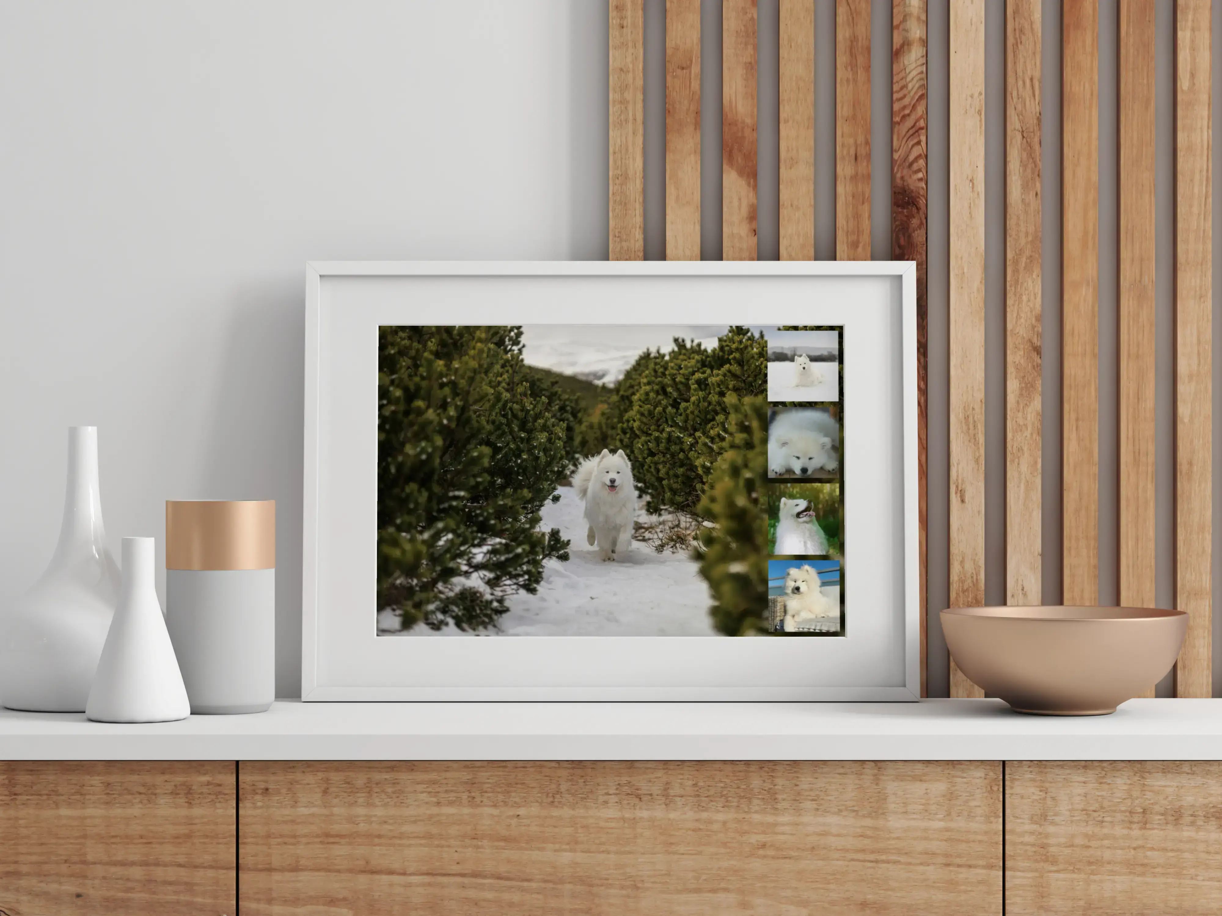 Für den Druck stehen dir hochwertige Materialien in verschiedenen Größen zur Verfügung. Du kannst deine Collage als Poster mit seidenmatter Oberfläche, als gerahmtes Bild im Holzrahmen, auf Leinwand, hinter Acrylglas, auf Alu-Dibond oder auf einer leichten Hartschaumplatte bestellen. Wenn du lieber selbst drucken möchtest, ist auch ein hochauflösender Download möglich.