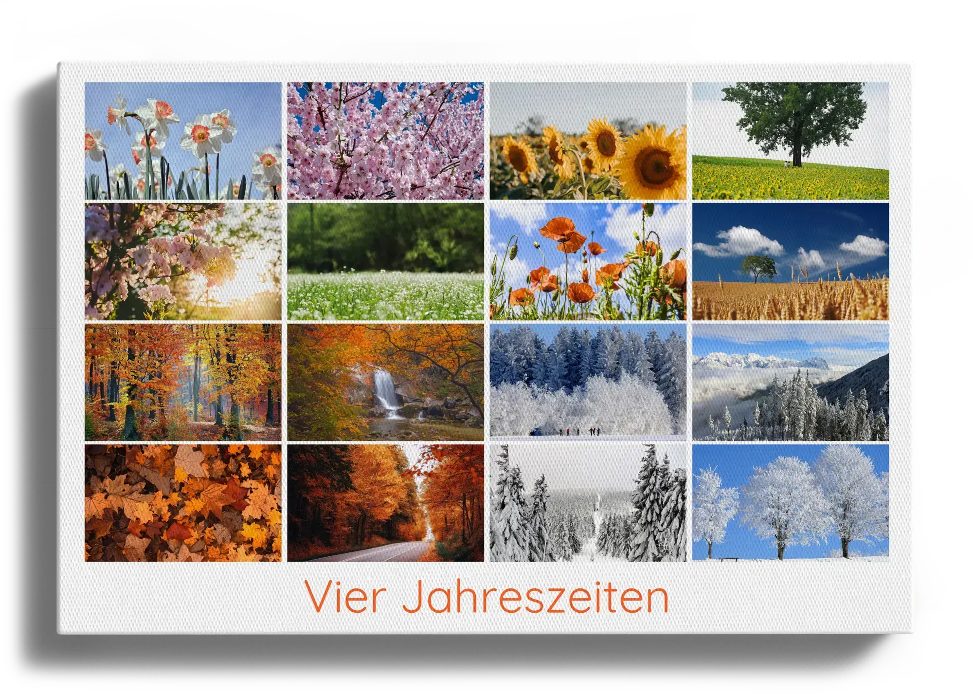 Starte jetzt und gestalte deine persönliche Jahreszeiten-Collage. Natur-, Landschafts- und Tierfotografie trifft auf Premium-Druck: zeig den Frühling mit blühenden Bäumen und Blumen, den Sommer mit Wiesen, Bäumen und warmem Licht, den Herbst mit farbigem Laub und den Winter mit stillen, schneebedeckten Wäldern.
