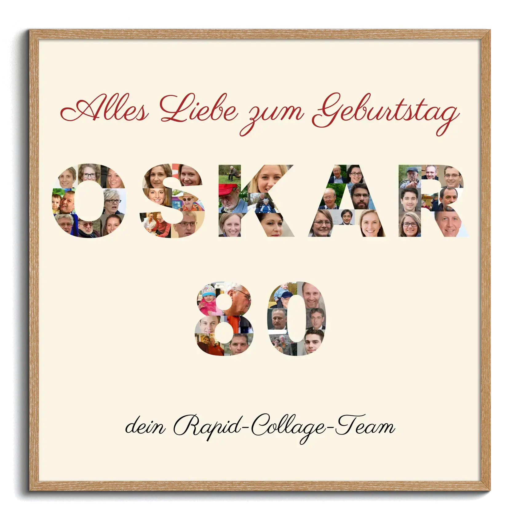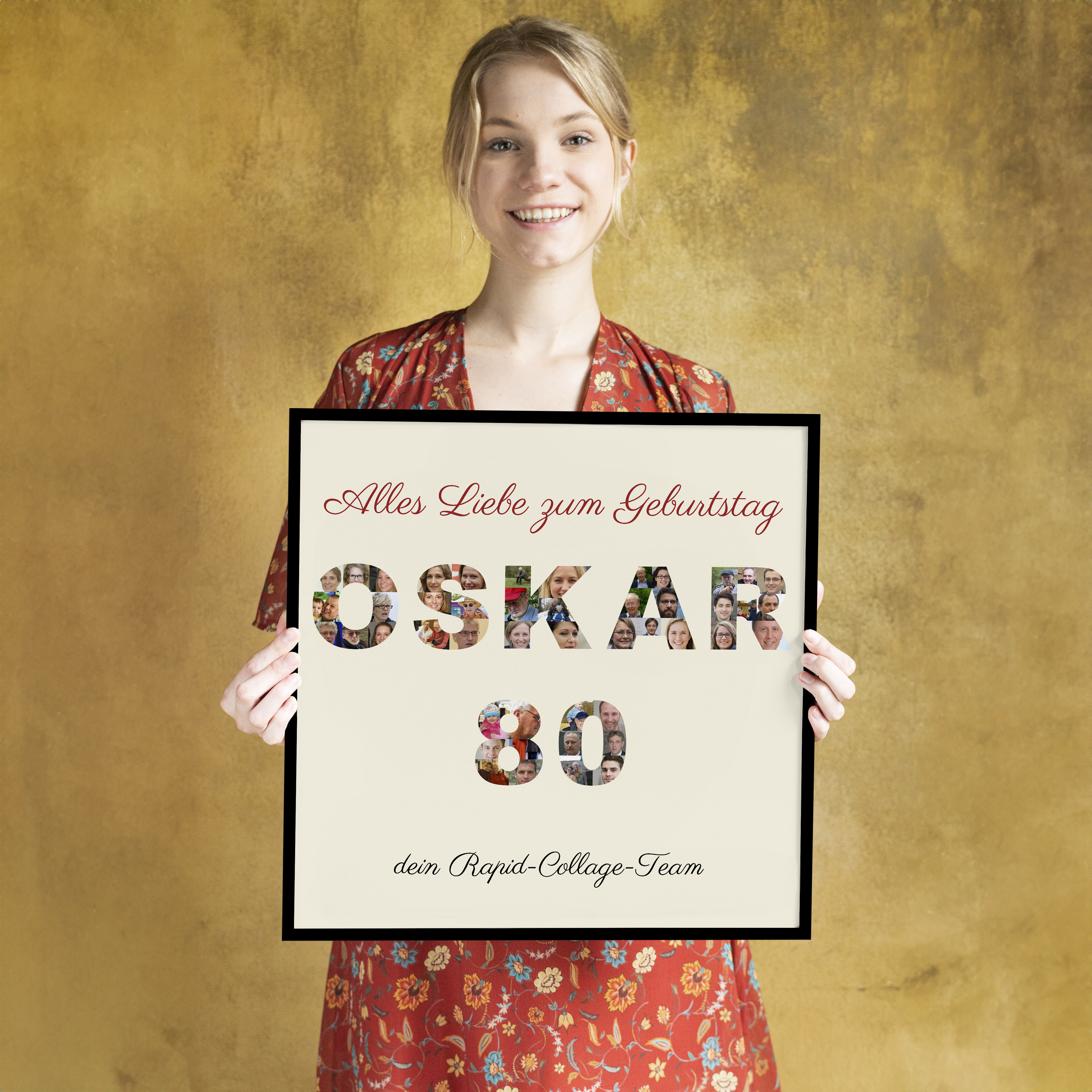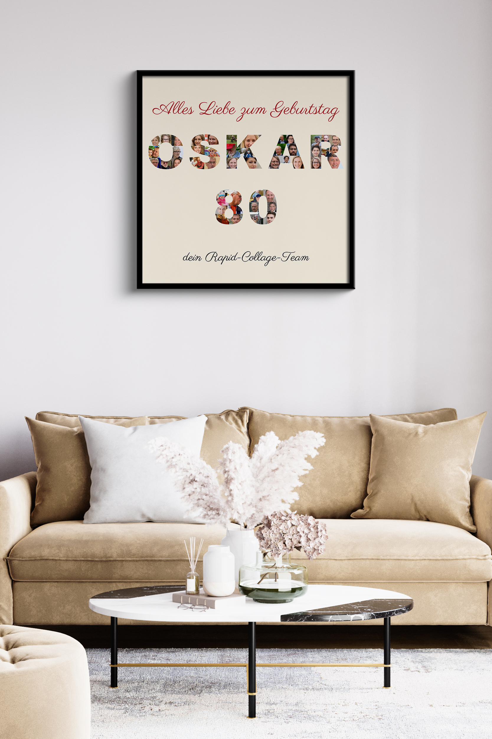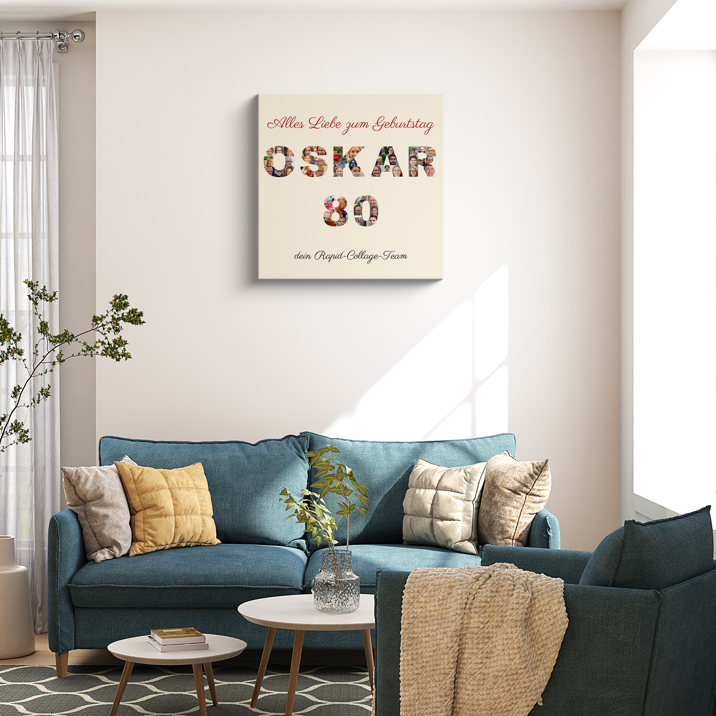 Geburtstagsüberraschung auf Leinwand: Fotocollage mit Namen und Zahl.