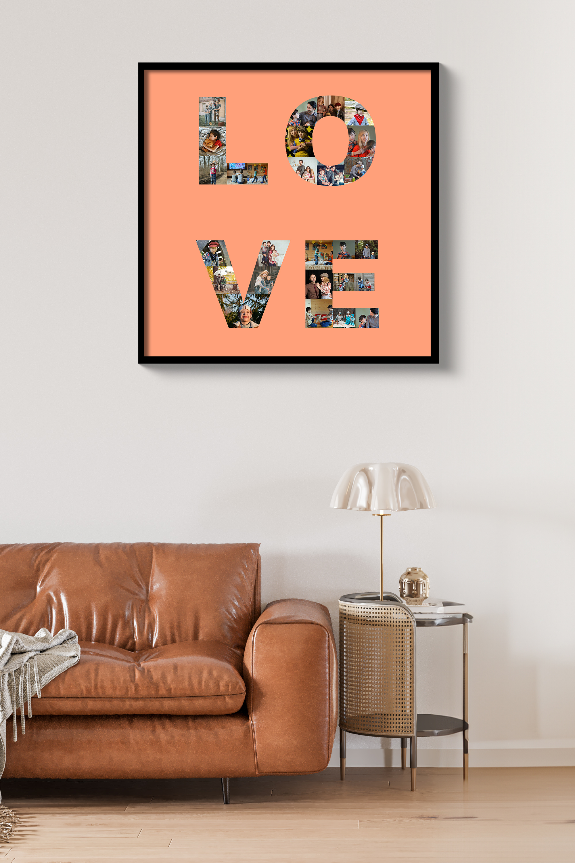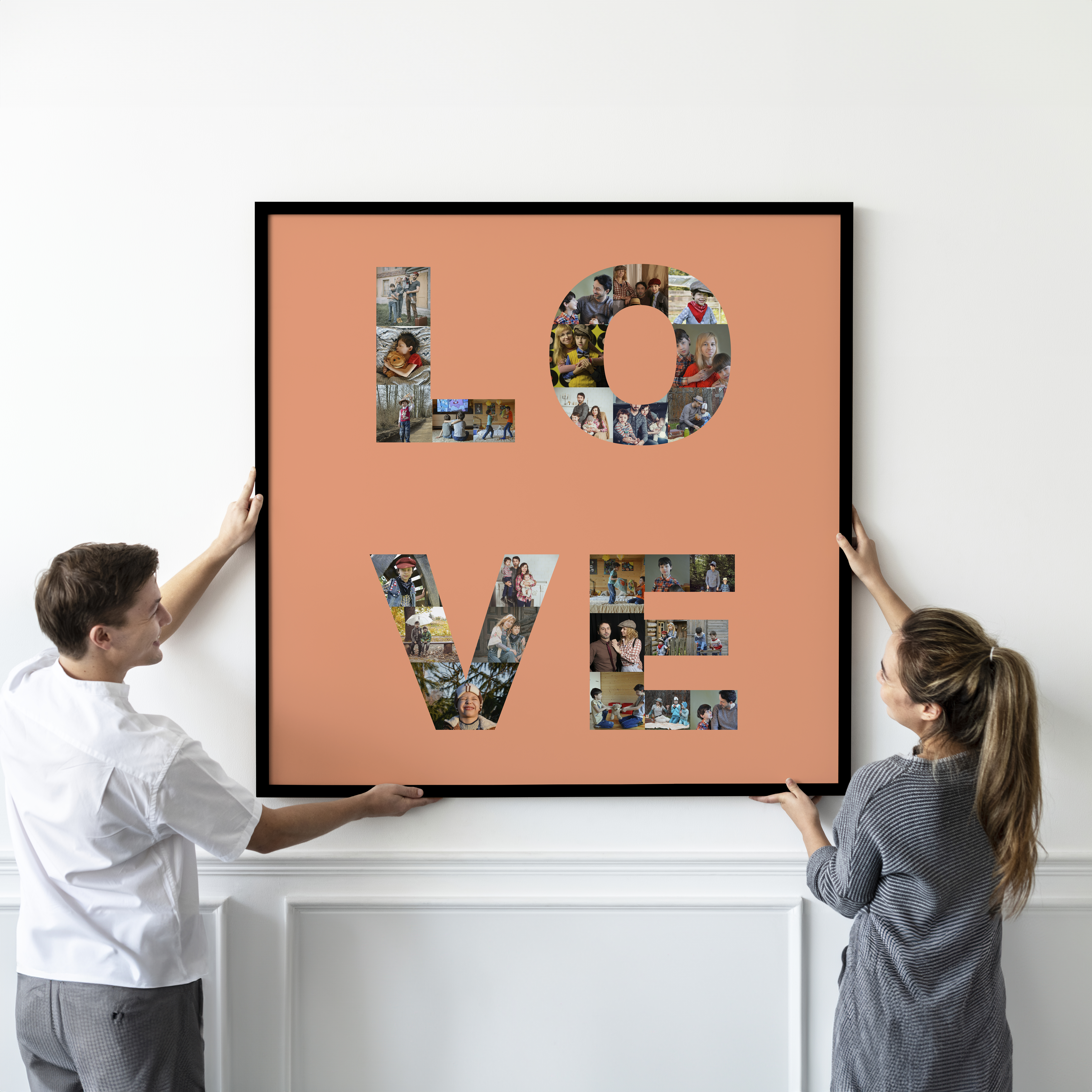 "Erstelle deine eigene Fotocollage, die genau deinen Vorstellungen entspricht." Jetzt hast du die Freiheit, deiner Kreativität mit dem personalisierbaren Fotocollagen-Produkt „LOVE“ freien Lauf zu lassen. Wenn es zur sogenannten Buchstabencollage kommt, kannst du vier deiner Lieblingsbilder zusammenfügen, um eine quadratische Collage zu kreieren. Stelle sie zum Beispiel im Format 40x40cm auf, oder wähle eine andere Option, die dir gefällt. Dein personalisiertes Fotogeschenk mit Botschaft wird sicherlich überzeugen.