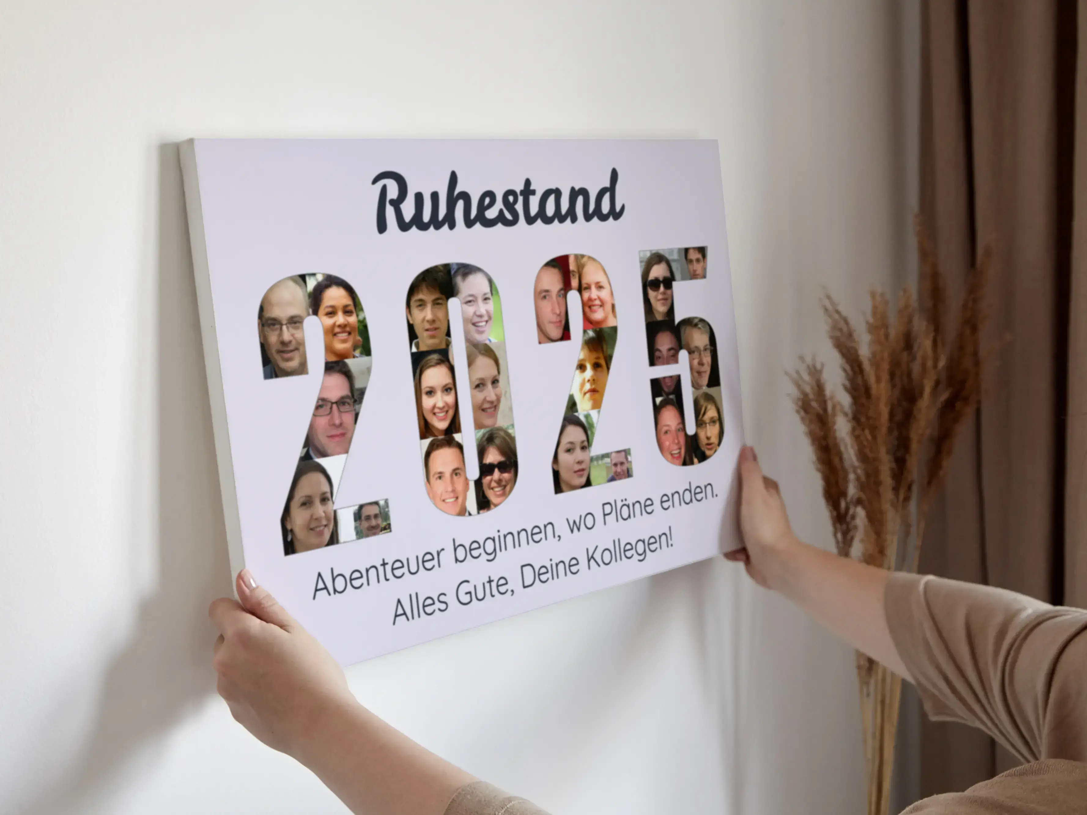 Personalisierte Fotocollage zum Ruhestand: Kollegiale Erinnerungen in Jahreszahl-Form als einzigartiges Geschenk.