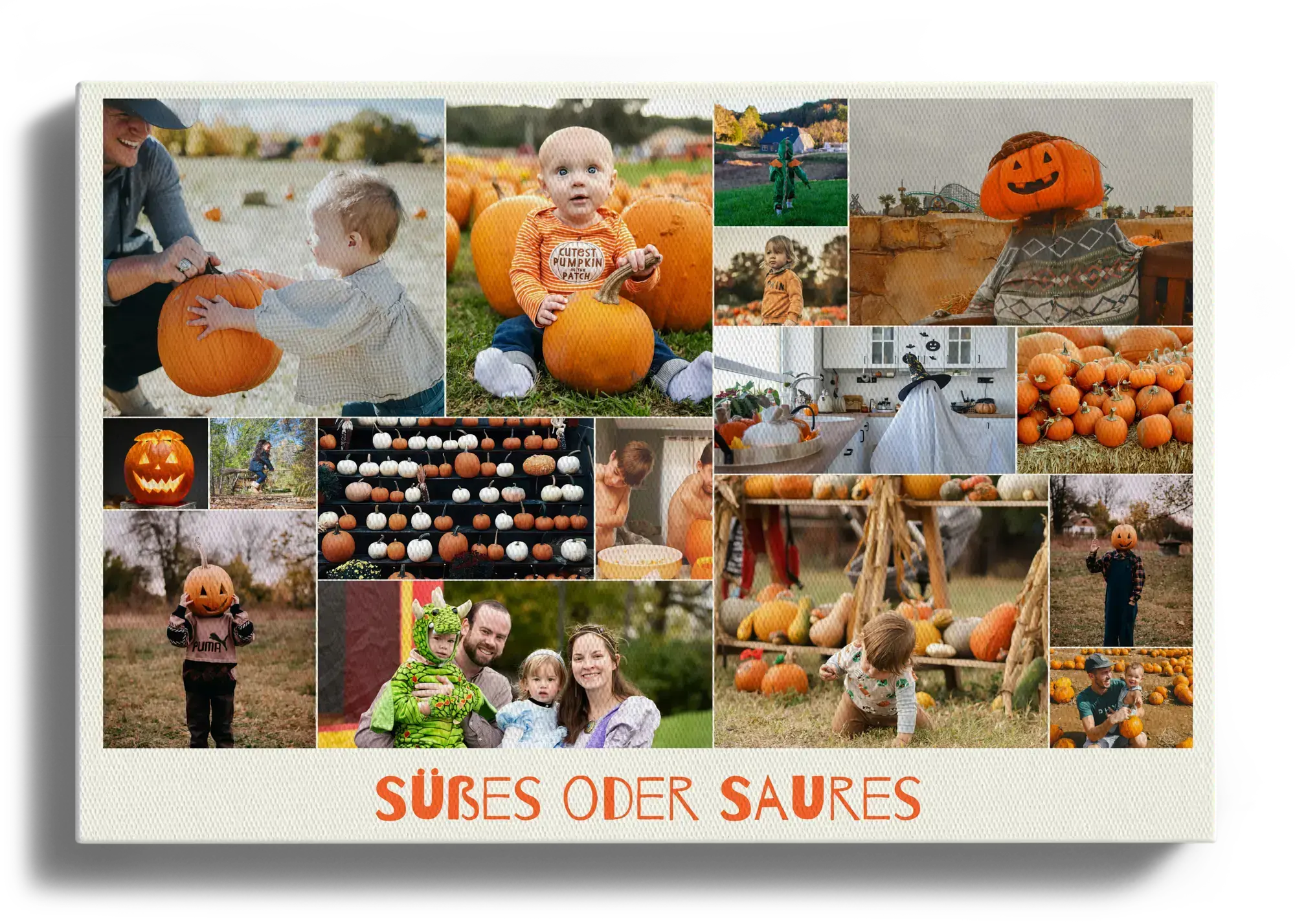 Gestalte deine persönliche Halloween-Fotocollage mit nur wenigen Klicks! Sammle zauberhafte Momente deiner Familie und Freunde, die in schaurigen Kostümen für unvergessliche Erinnerungen sorgen. Verleihe deiner Collage eine persönliche Note mit witzigen oder gruseligen Texten, wie zum Beispiel Süßes oder Saures. Deine Collage wird zum Blickfang in jedem Raum und sorgt garantiert für gute Laune.