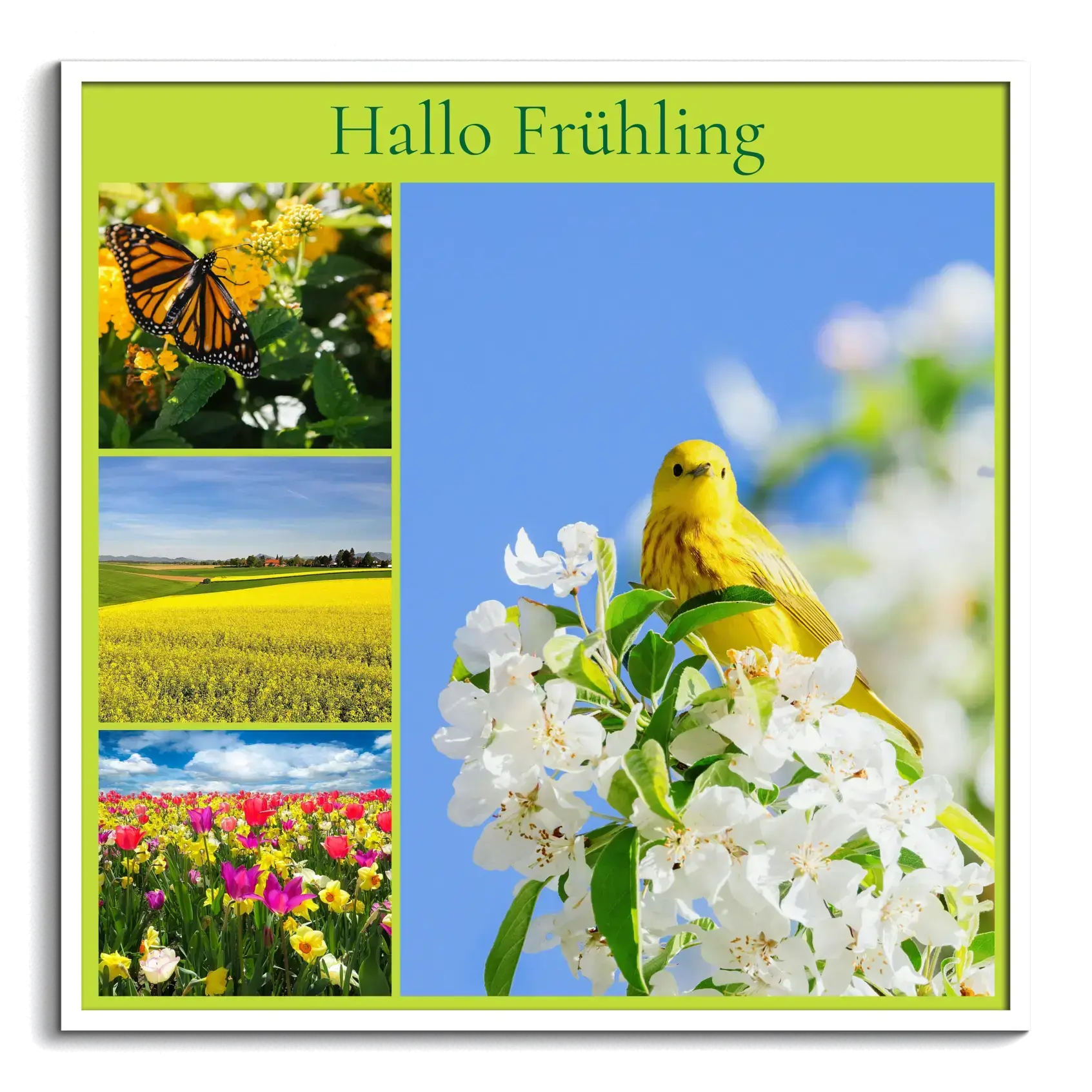 Jetzt deinen Frühlings-Kunstdruck gestalten und sofort bestellen. Frühlingsgefühle bringt Blumen, blühende Wiesen und frisches Grün als saisonales Wandbild an die Wand. Wähle Vorlagen von Herz bis Raster, kombiniere eigene Frühlingsfotos mit kurzen Texten wie Hallo Frühling und setze die Motive stimmig vom kleinen Poster bis zur großen Leinwand in Szene.