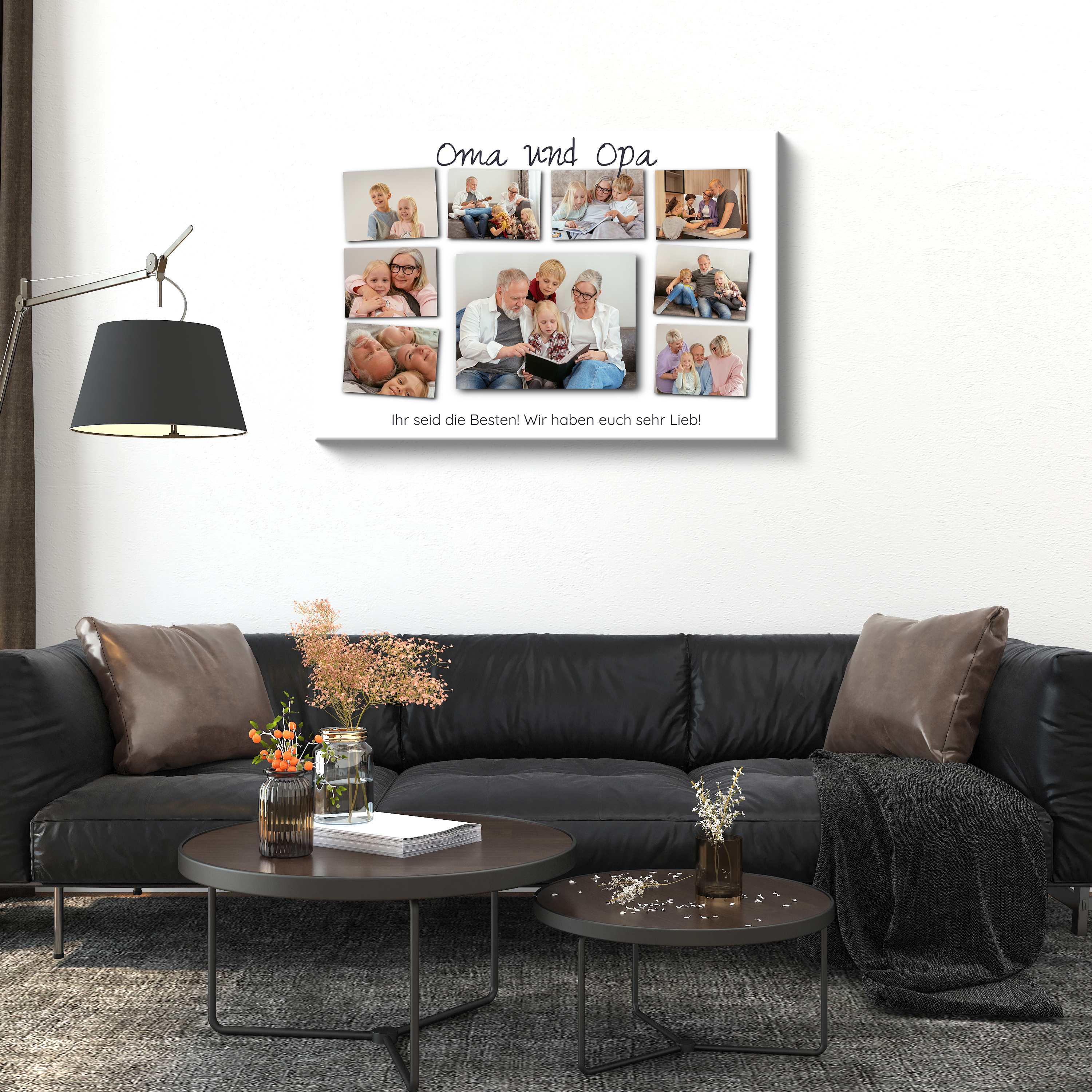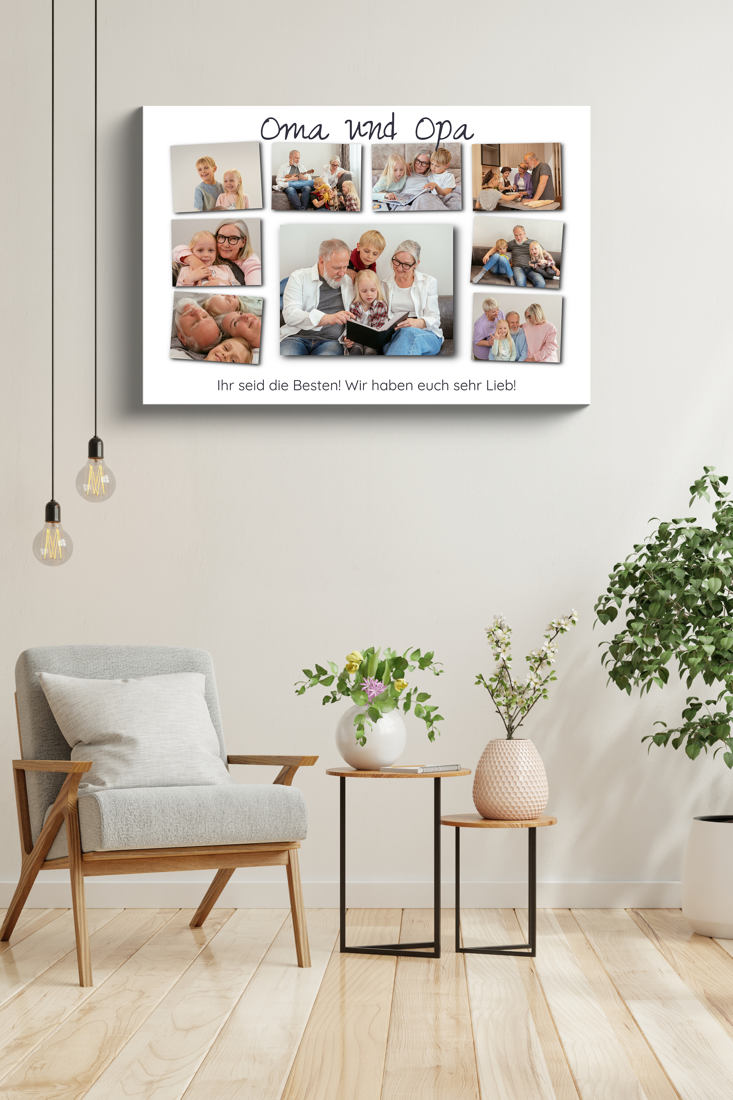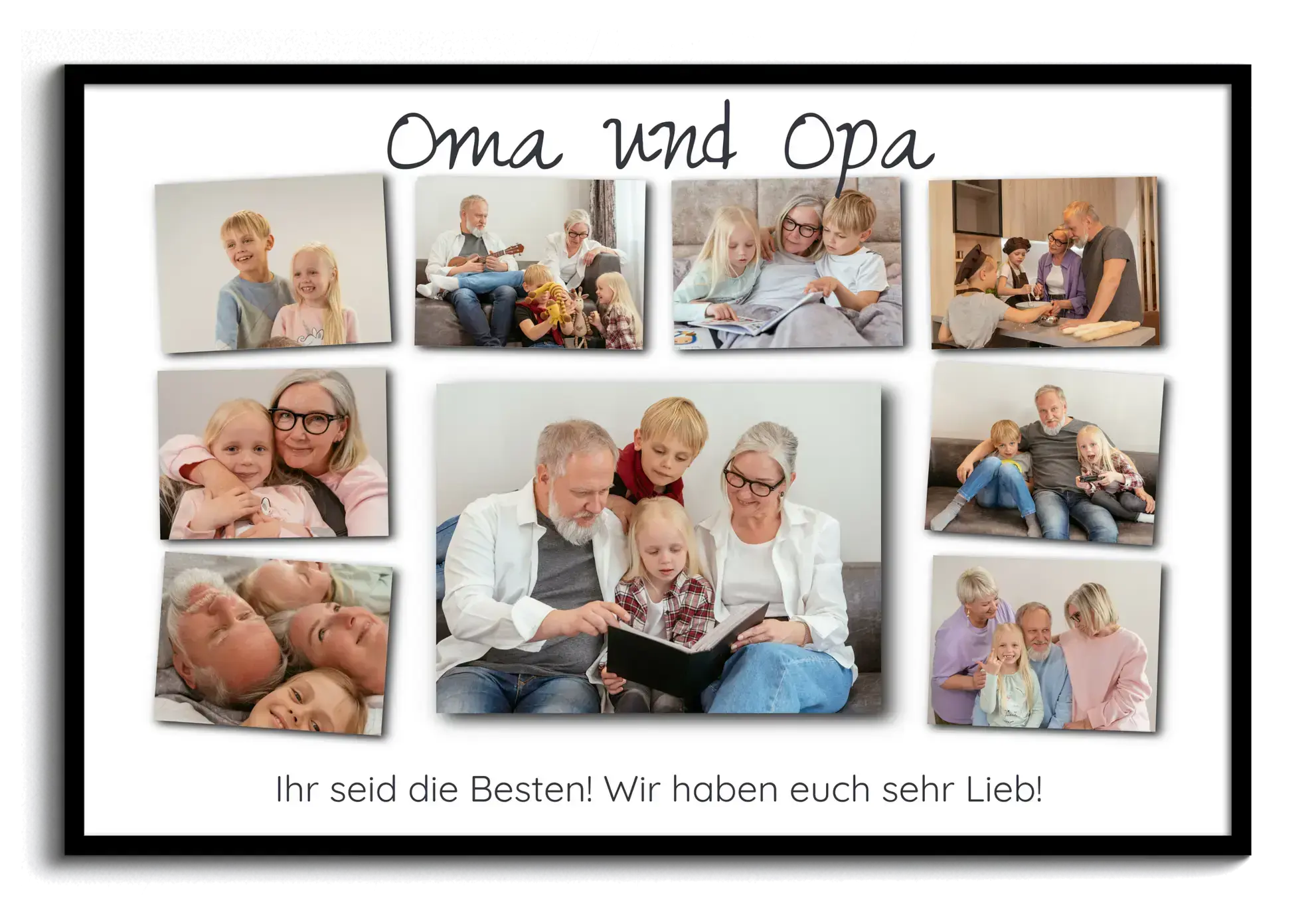 Erstelle jetzt deine persönliche Fotocollage und verschenke Erinnerungen. Beispiel: ein Geschenk für Oma und Opa mit 9 Fotos von Großeltern und Enkeln, mittig ein größeres Bild, dazu der Spruch Oma und Opa. Ihr seid die Besten! Wir haben euch sehr lieb! Perfekt für Geburtstag, Jubiläum oder Feiertage.