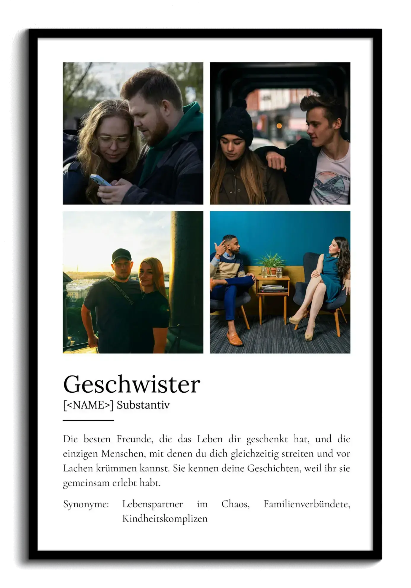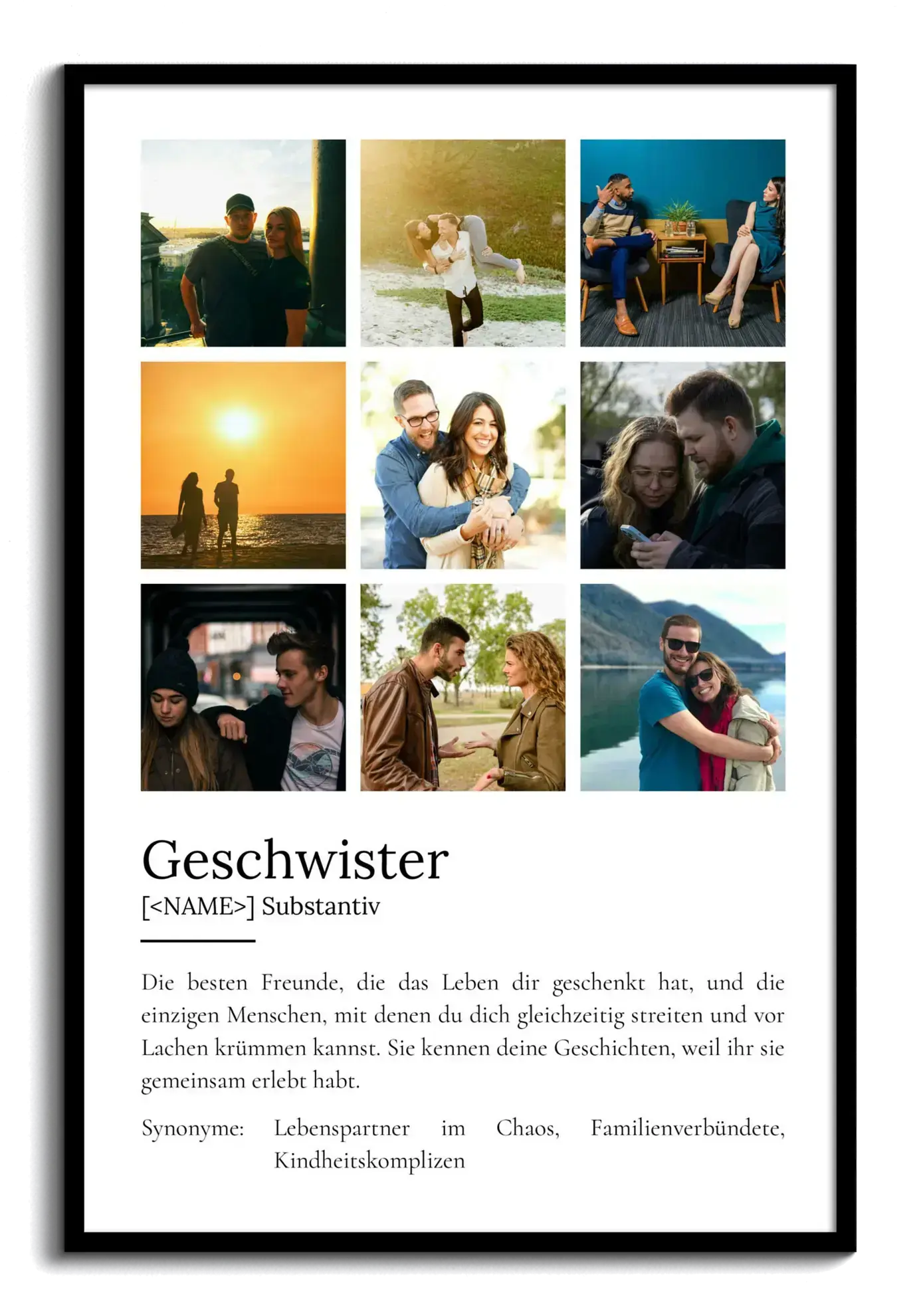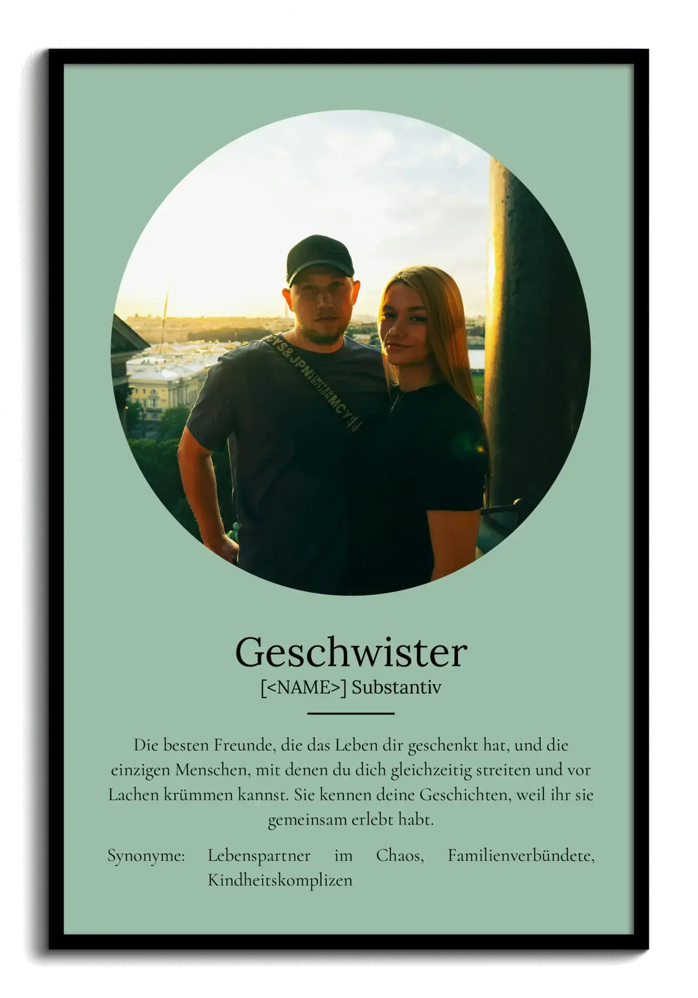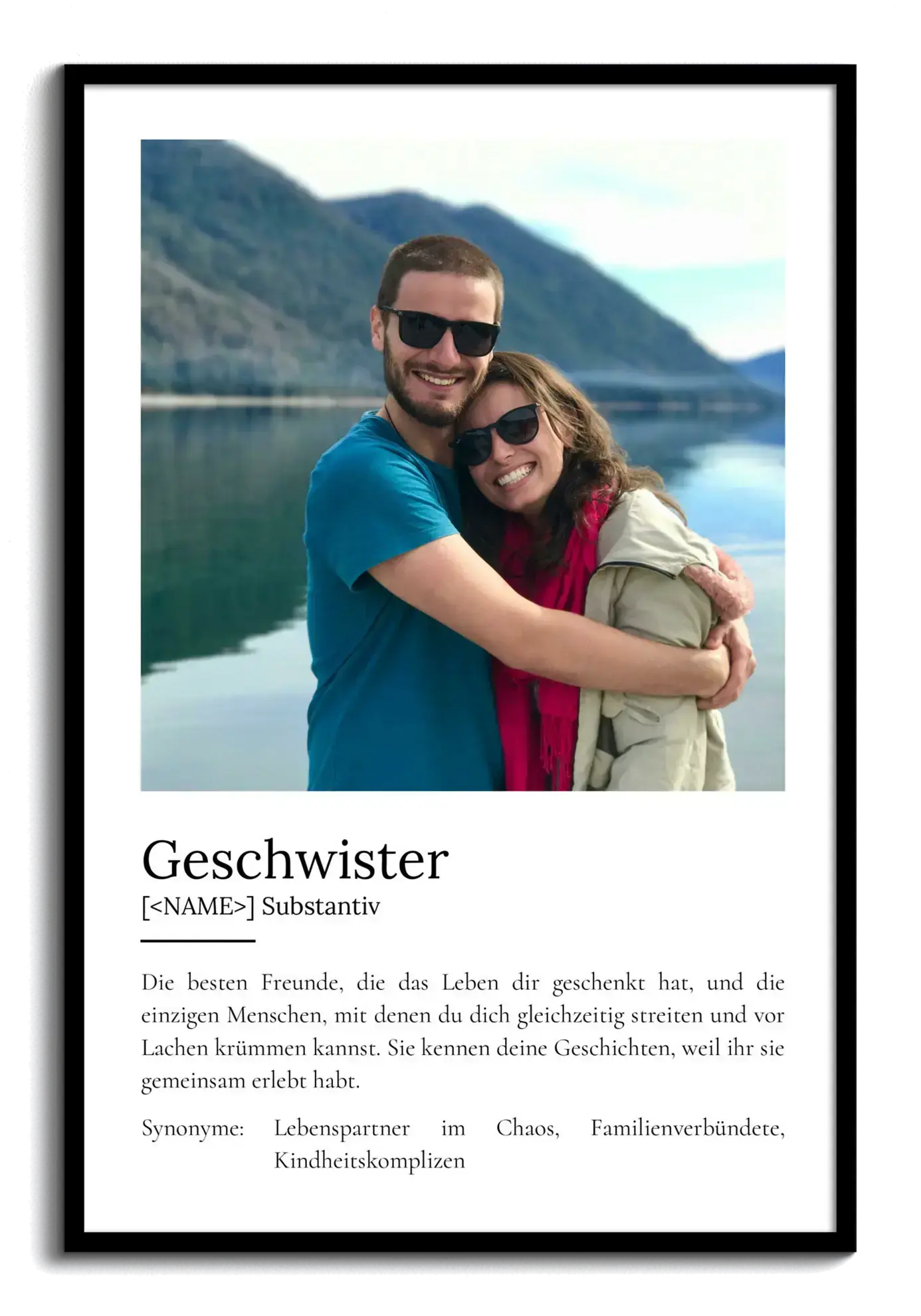 Definitionsposter Geschwister: Persönliches Geschenk, Platz für Foto und individuellen Text im Duden-Stil.