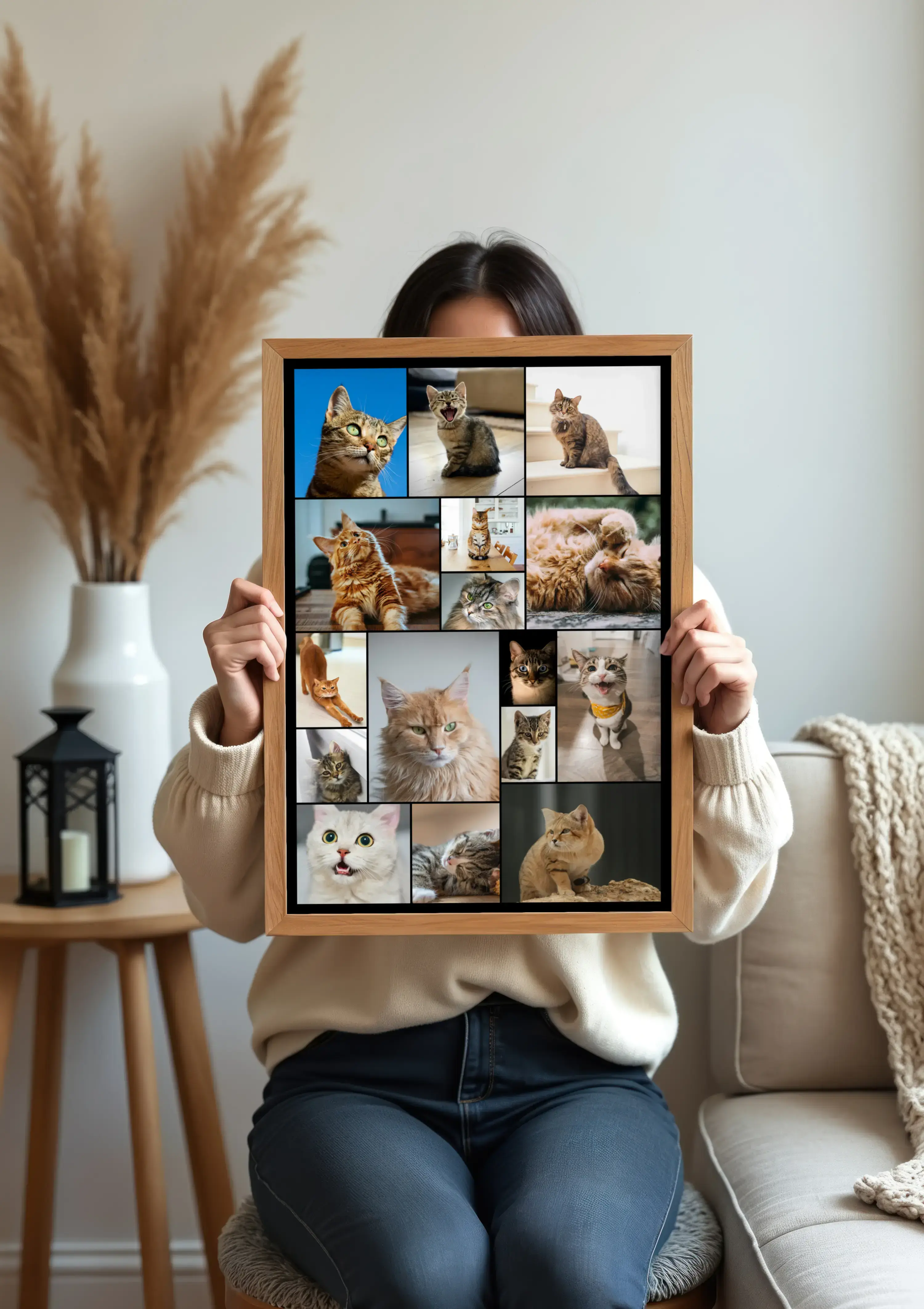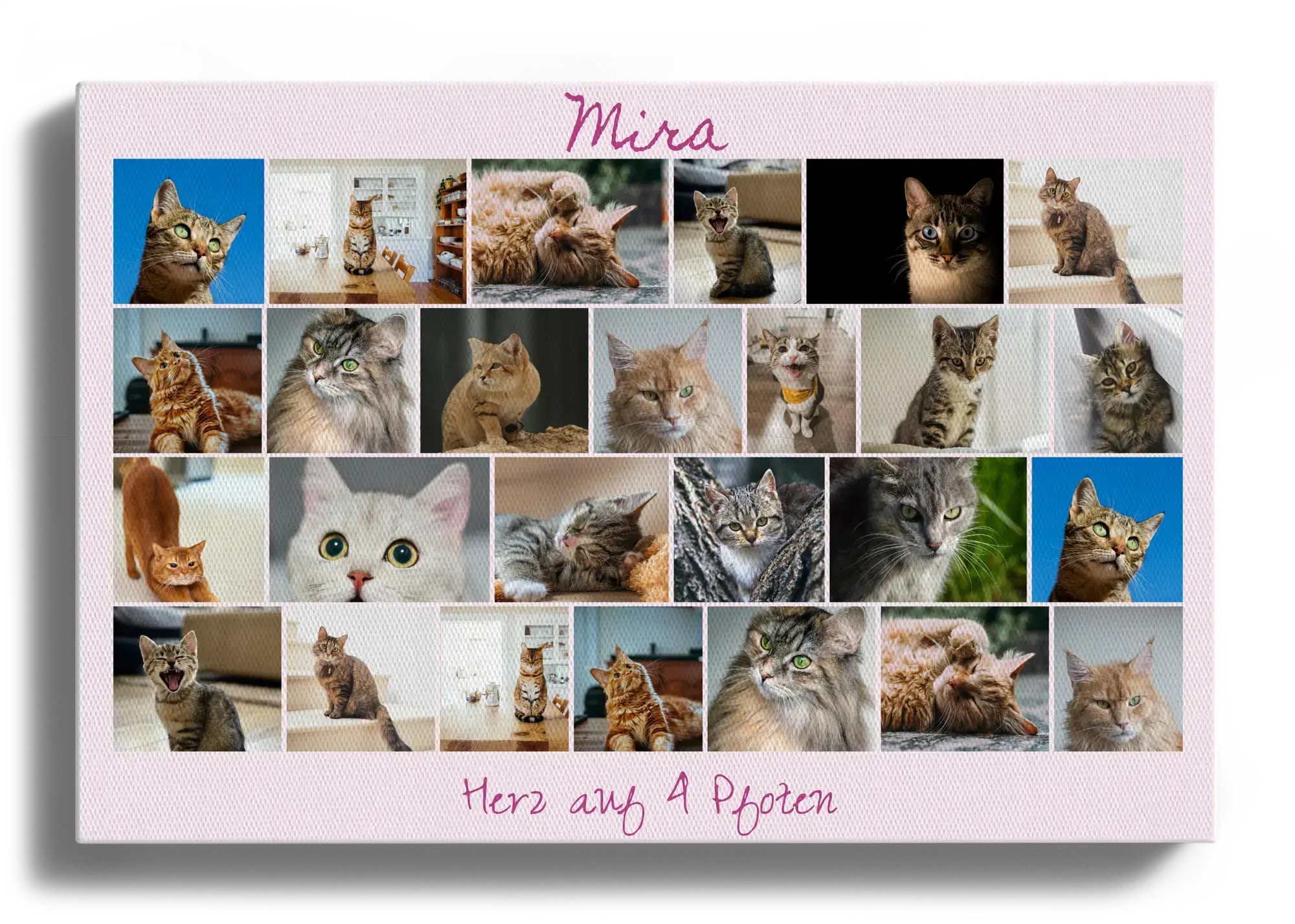 Jetzt gestalten und bestellen: Setze deine Katze perfekt in Szene – vom frechen Schnappschuss bis zum Kuschelmoment. Lade mehrere Bilder hoch und arrangiere sie in Herz-, Raster- oder Textformen. Verleihe dem Motiv eine Überschrift wie Herz auf 4 Pfoten und wähle Größe sowie Material nach Geschmack.