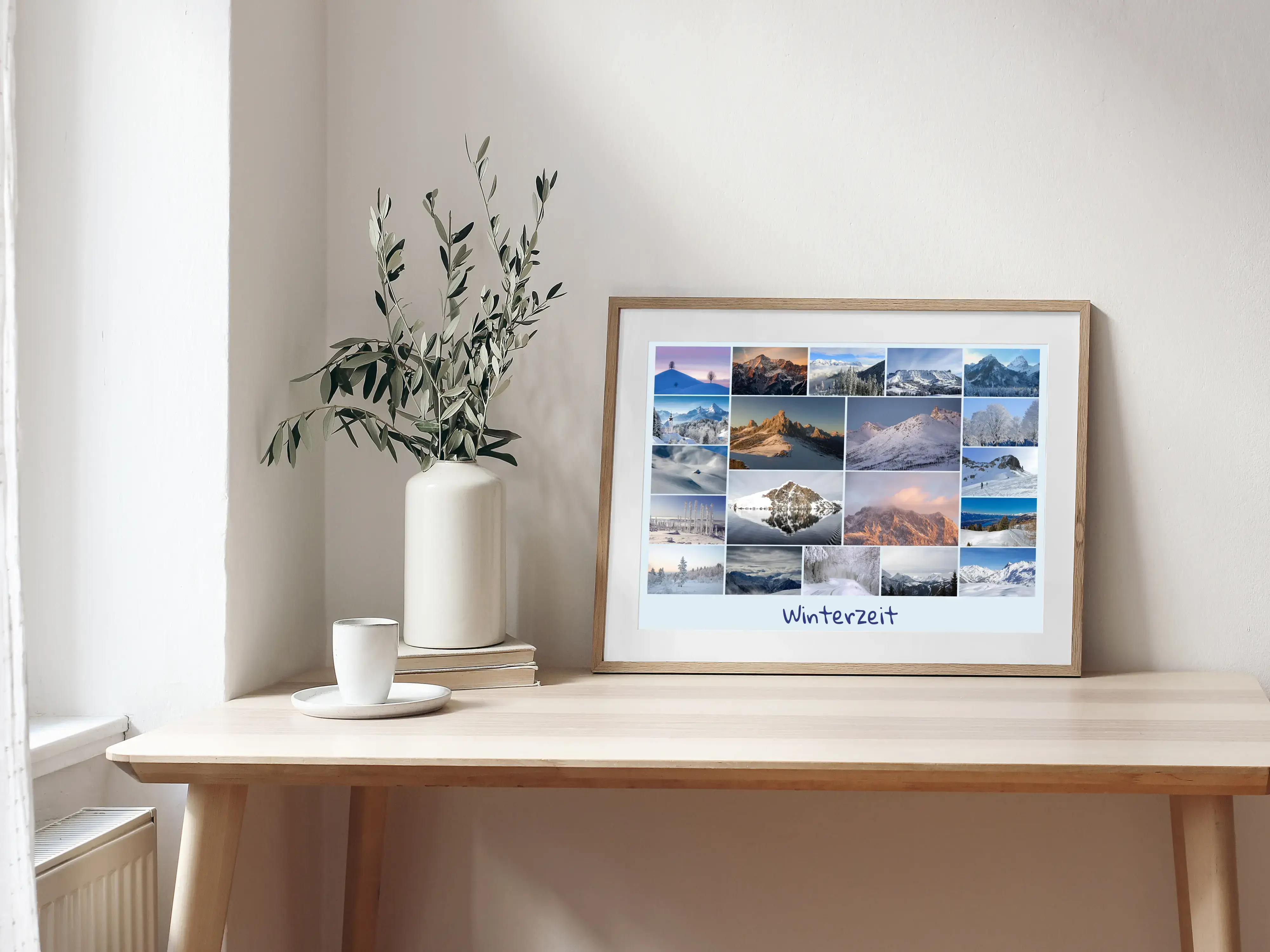 Starte jetzt und gestalte deine persönliche Landschafts-Collage: sammle Wälder in Sommer, Frühling, Herbst und Winter, goldene Herbststraßen, blühende Sommerwiesen, Berge mit schneebedeckten Gipfeln und stimmungsvolle Winterzeit in einem Premiumdruck. In wenigen Minuten entsteht dein Natur-Highlight für die Wand.