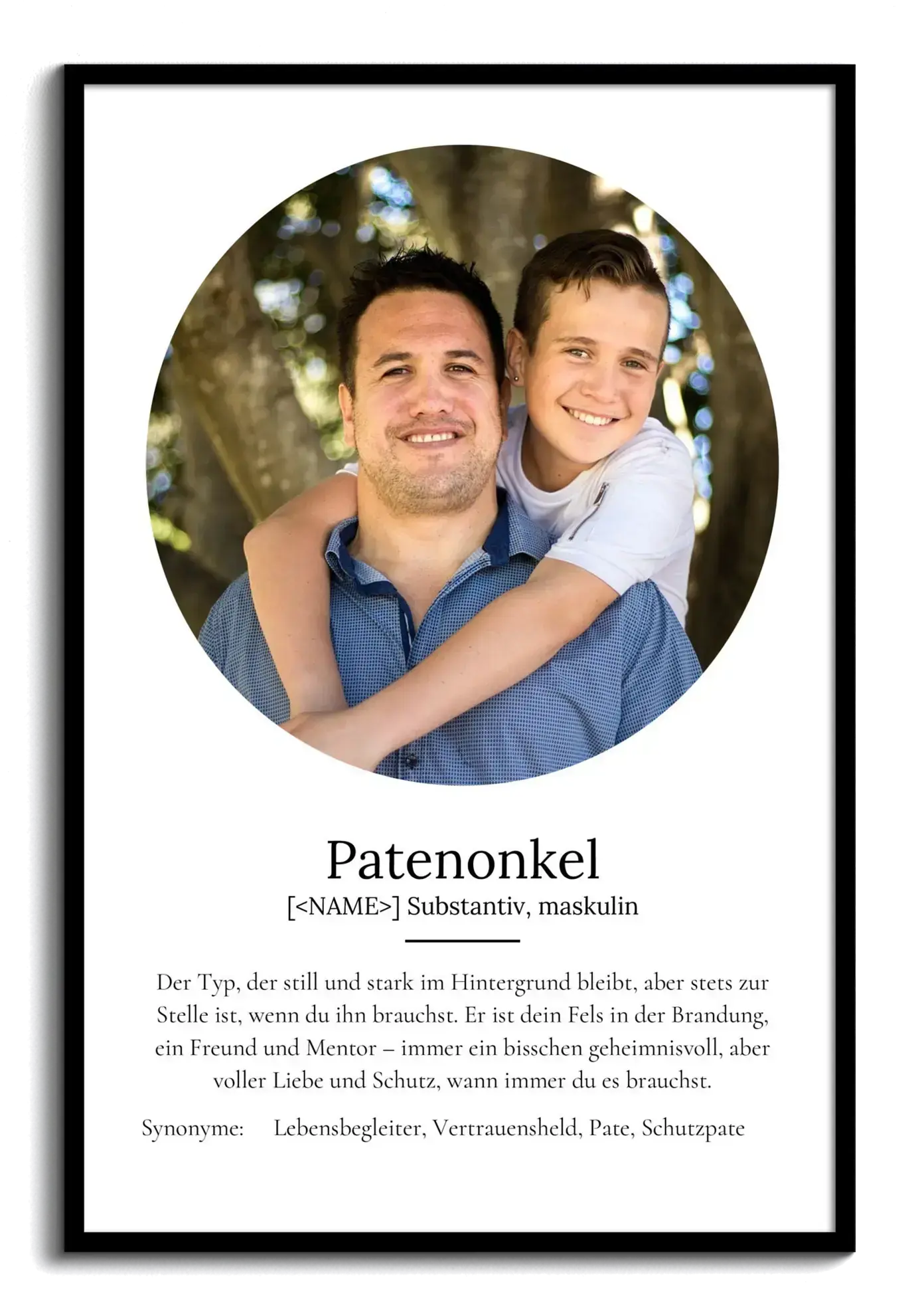 Mit unserem Definitions-Poster Patenonkel im Duden-Stil geht das ganz einfach. Du kannst direkt auf unserer Webseite deine eigene Definition einfügen und ein persönliches Foto hochladen. Innerhalb weniger Minuten gestaltest du so ein hochwertiges und individuelles Geschenk.