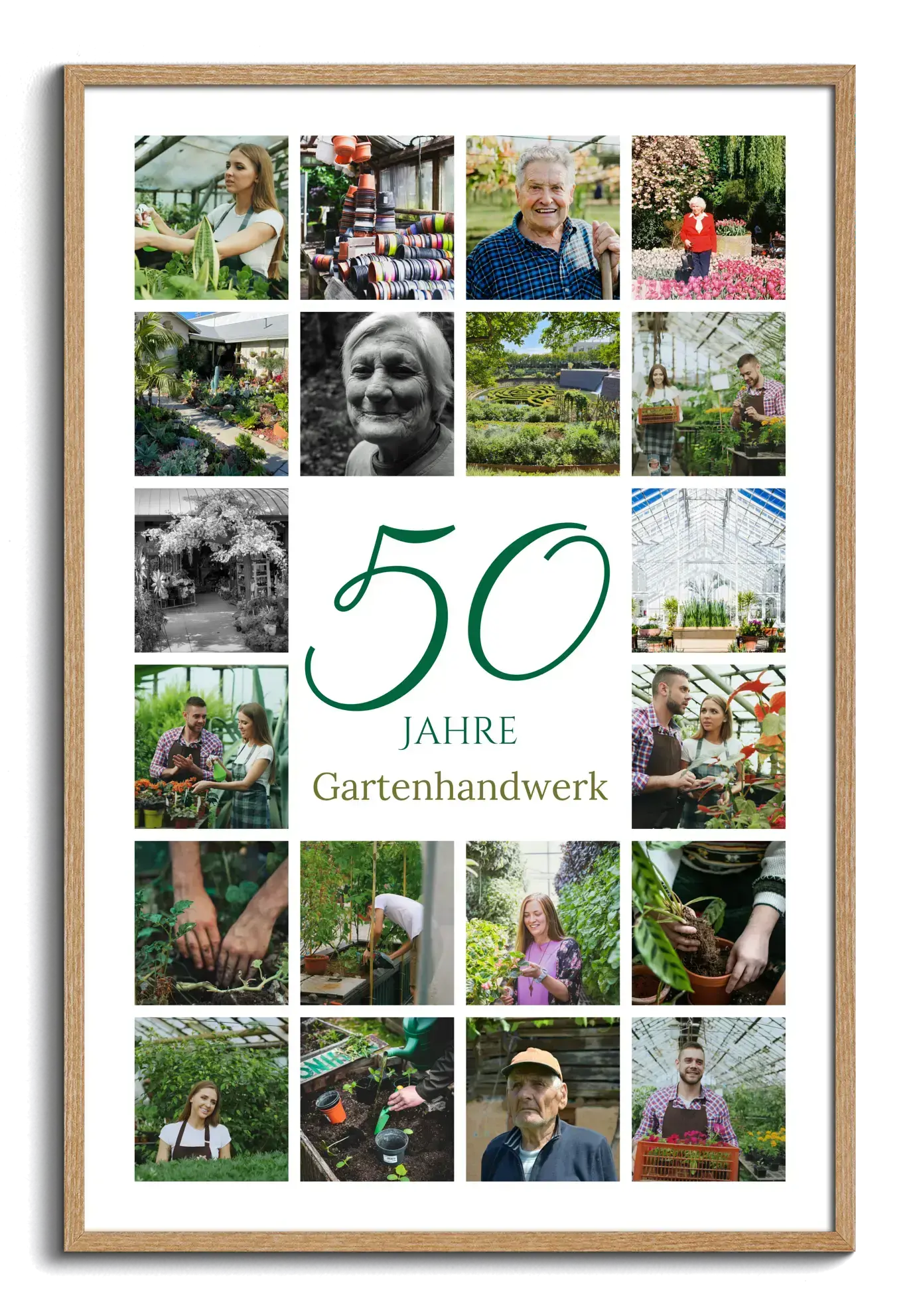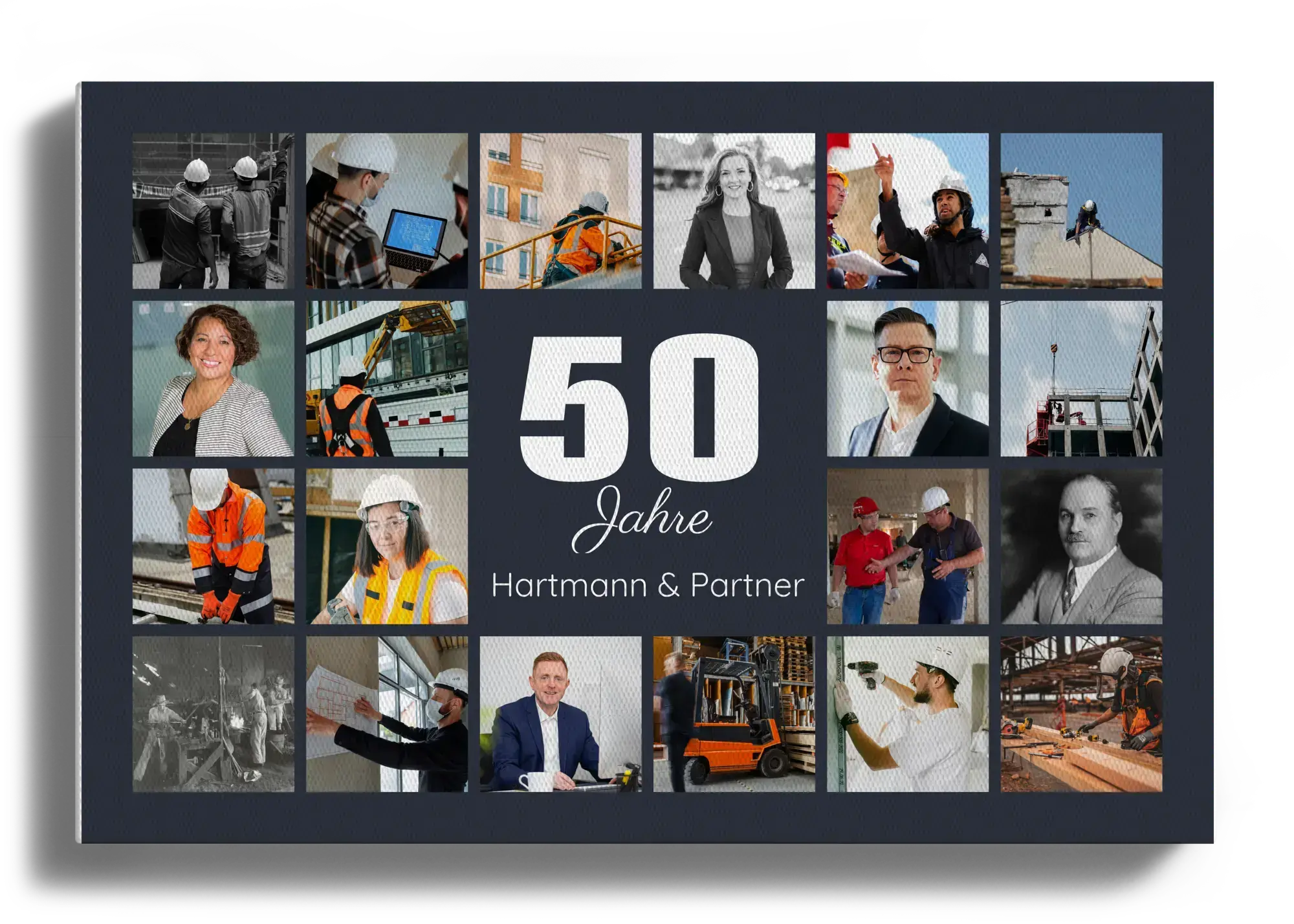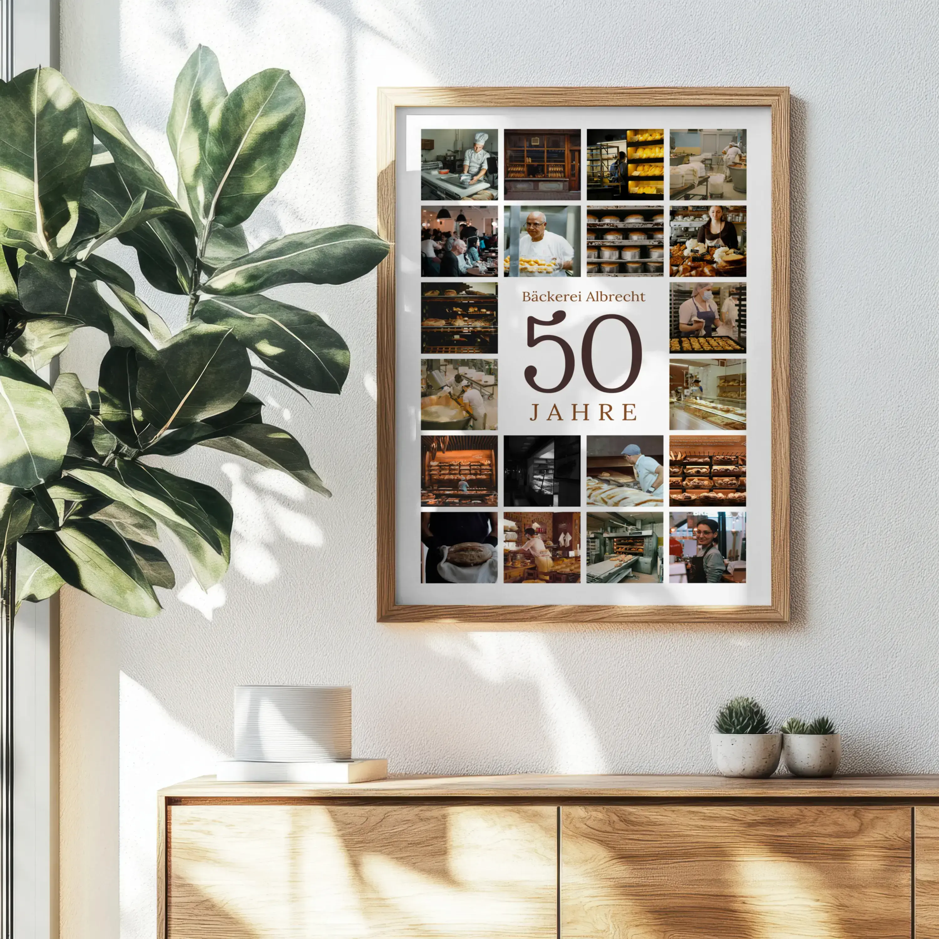 Jetzt gestalten und bestellen. Zum 50. Firmenjubiläum steht eine große 50 im Zentrum; oben kannst du den Firmennamen setzen, darunter einen kurzen Jubiläums- oder Dankestext. 20–80 Fotos bilden in einem gleichmäßigen Raster den Rahmen. Zahl, Name, Text, Hintergrund, Farben sowie Hoch- oder Querformat sind frei anpassbar.