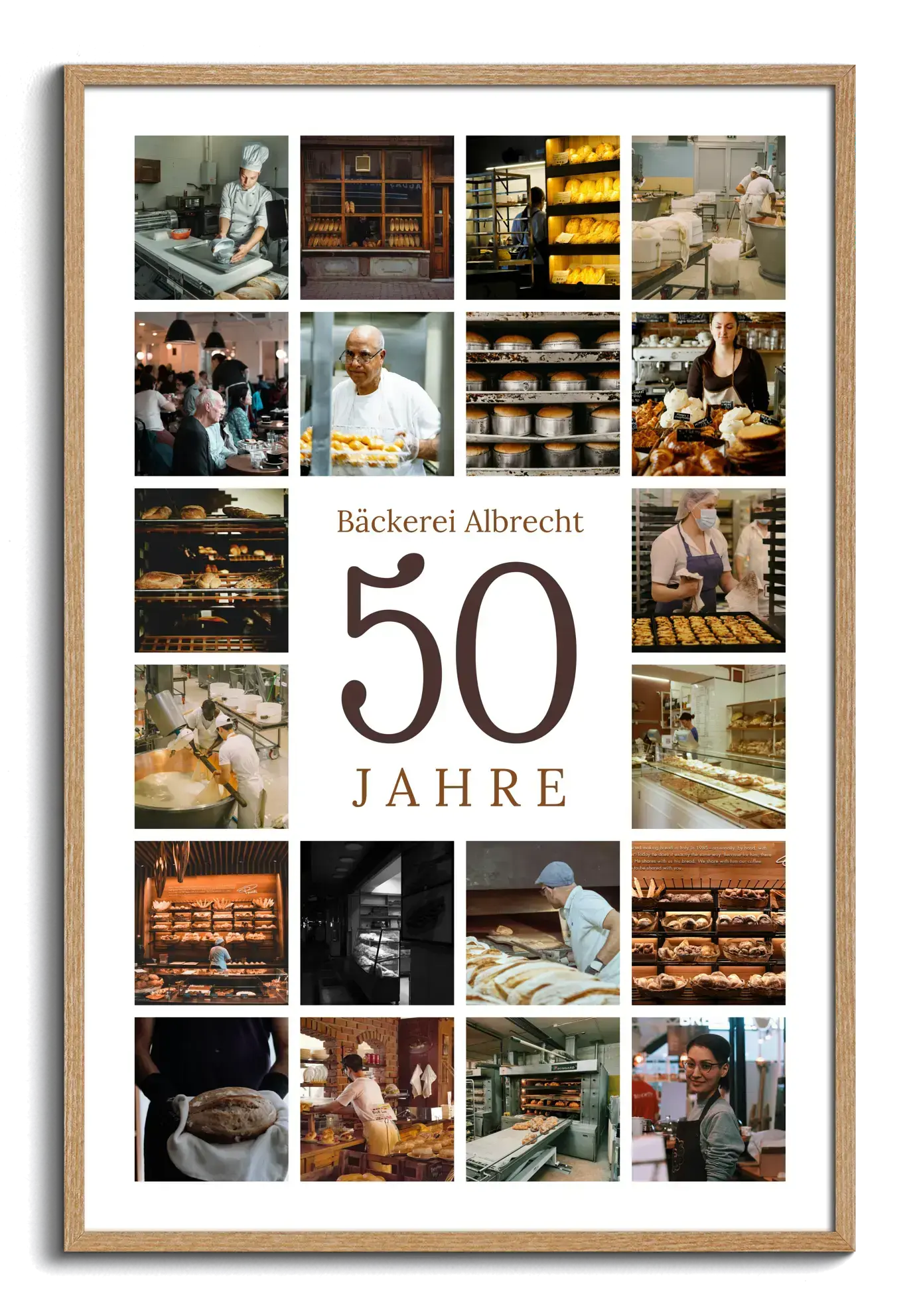 Passe Jubiläumszahl, Firmennamen, Texte, Anzahl und Anordnung der Bilder, Abstände, Kanten, Hintergrund und Farben an. Wähle Hoch- oder Querformat, setze Schriften und Größen, justiere Bildausschnitte und nutze auf Wunsch dezente Effekte. Alles bleibt flexibel und jederzeit änderbar.