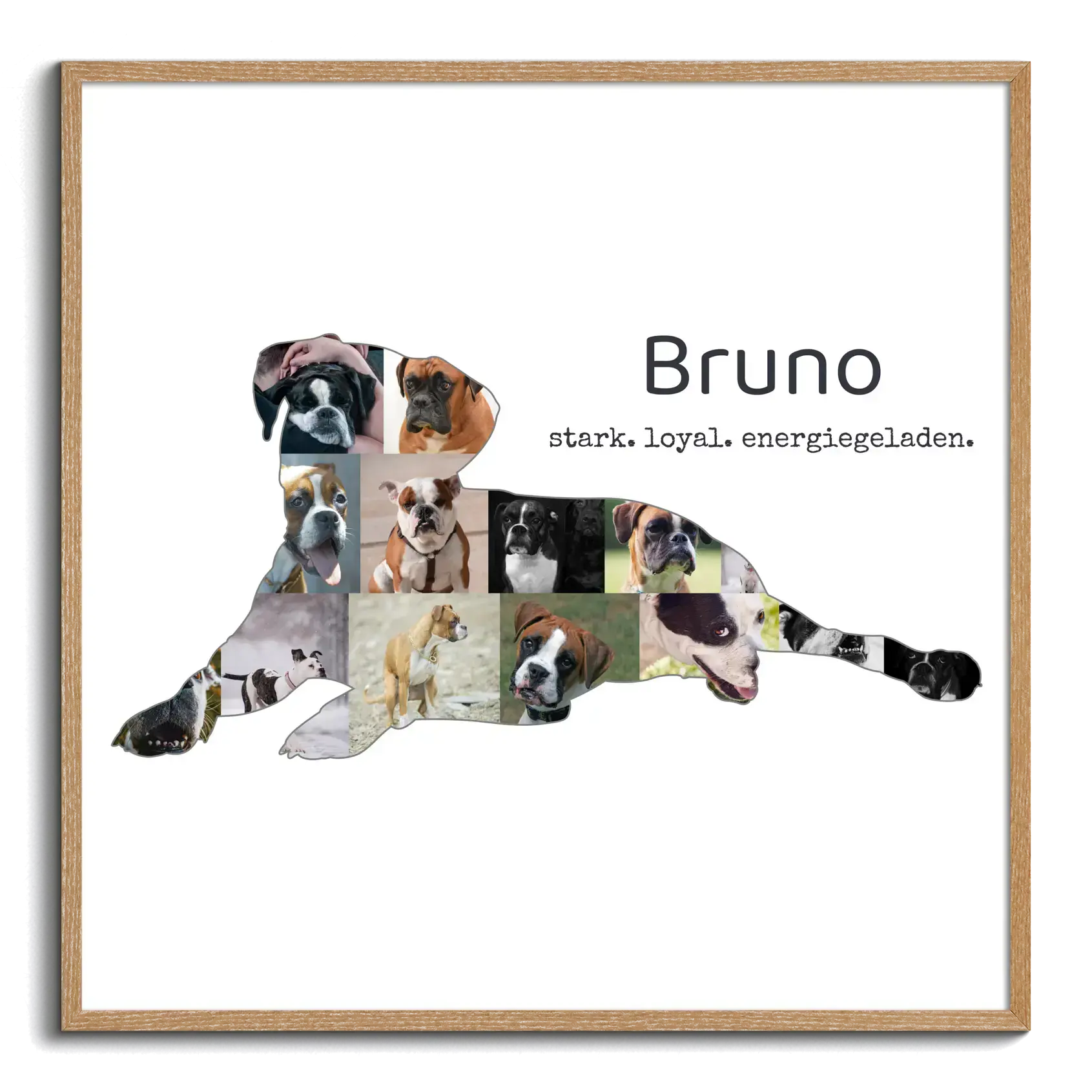 "Erwecke deine schönsten Erinnerungen mit deinem treuen Vierbeiner zum Leben und kreiere eine einzigartige Fotocollage in Form eines stolzen Boxers!" Lass dich von bezaubernden Momenten mit deinem Boxer in den Bann ziehen, indem du sie lebendig in einer einzigartigen Fotocollage festhältst, die bis zu 20 deiner kostbarsten Fotos stolz zur Schau stellt.