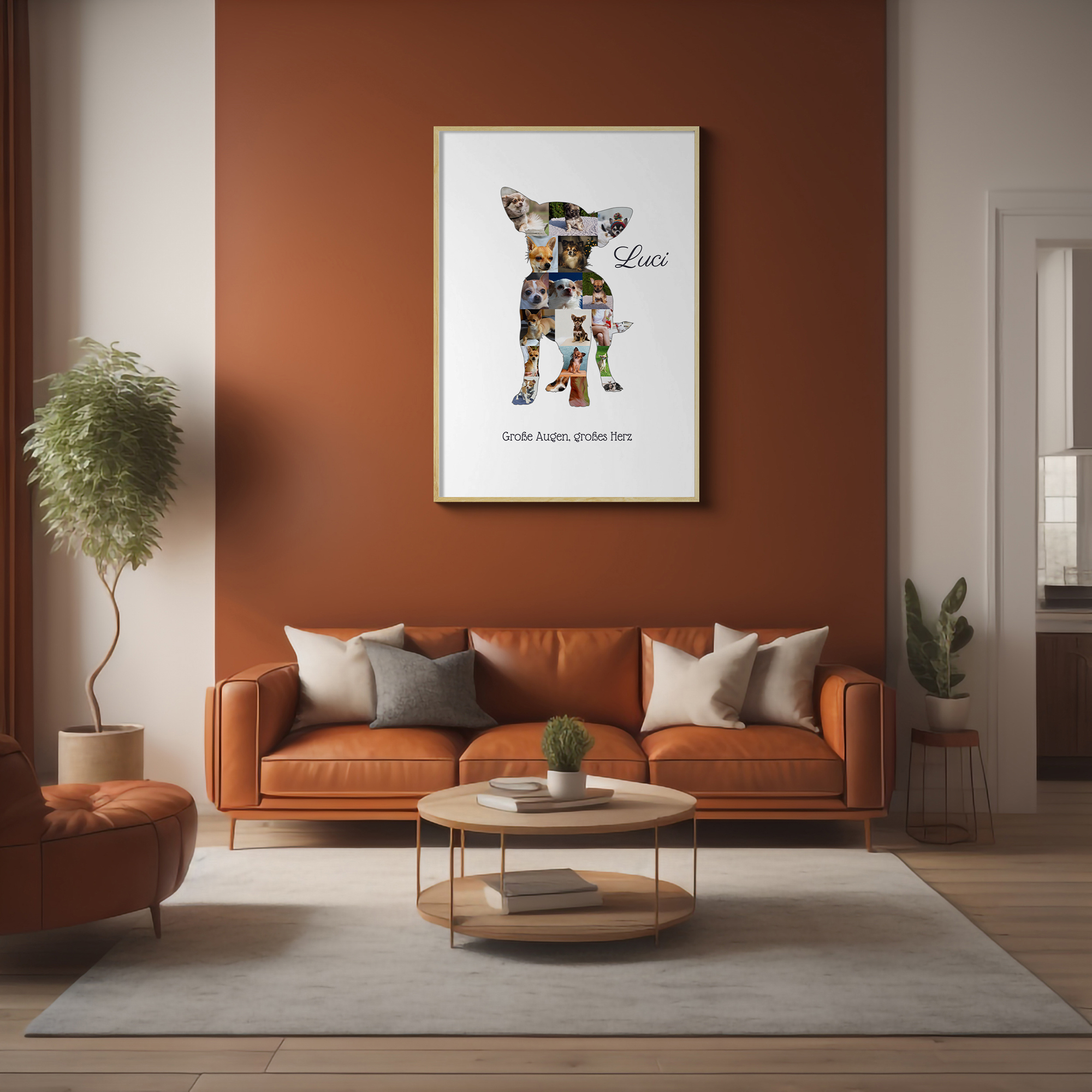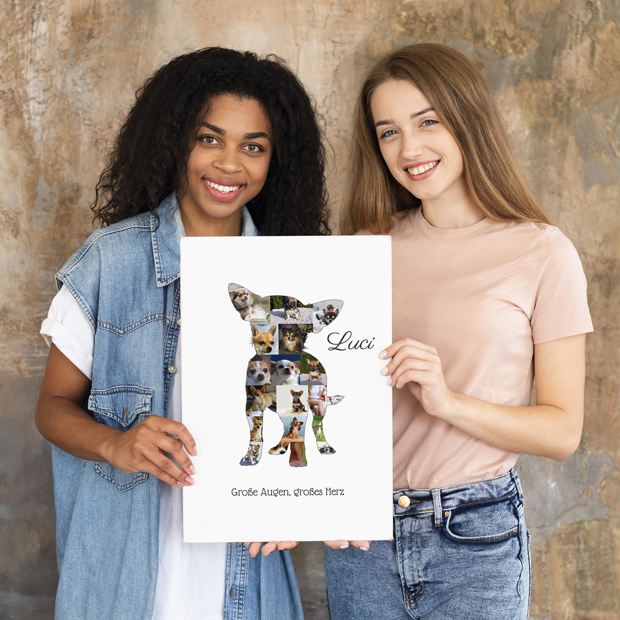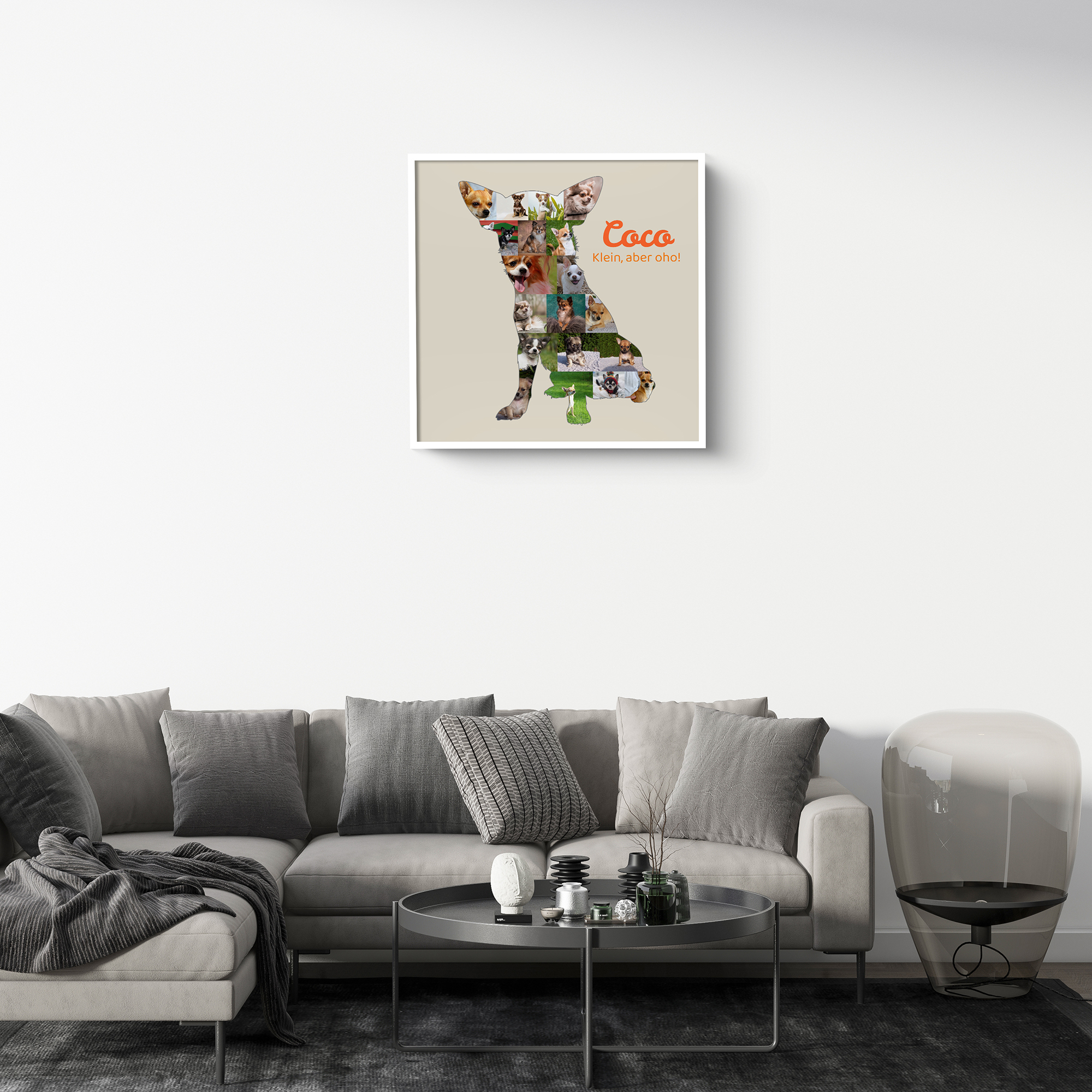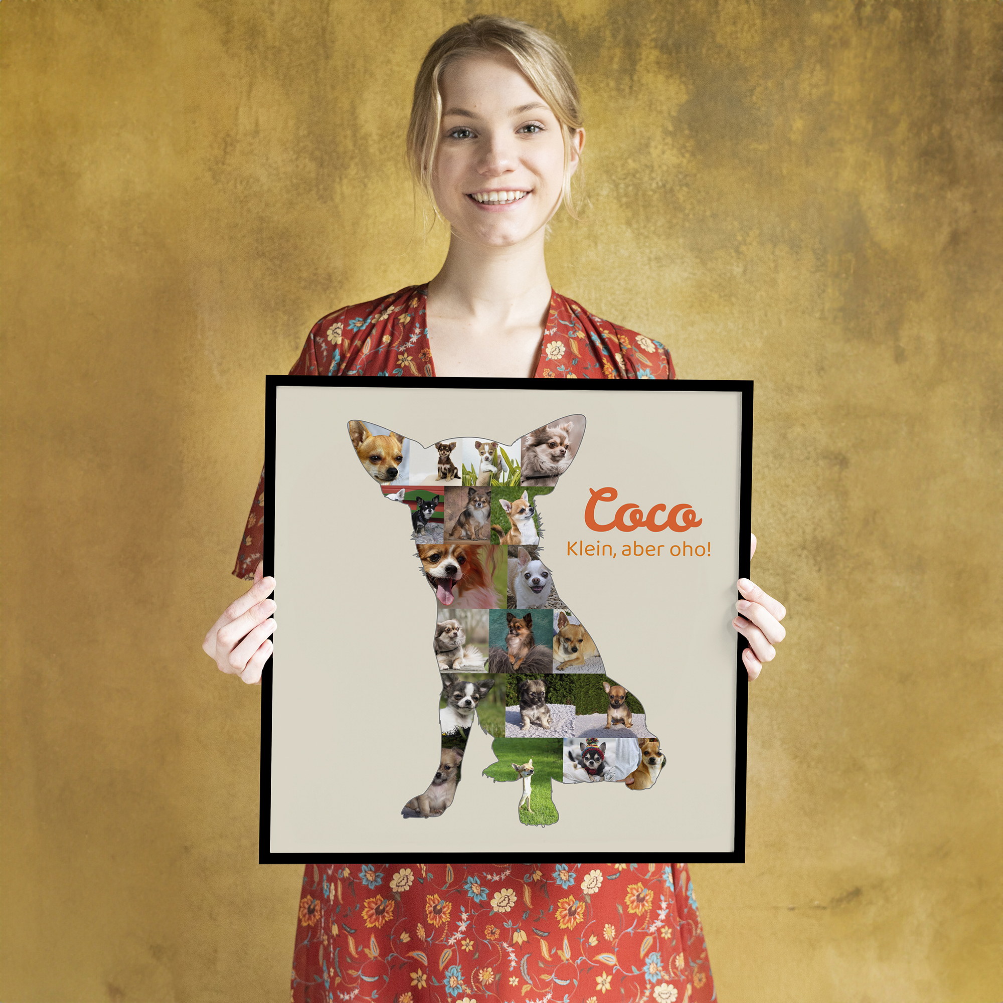 Lass die Erinnerungen an deinen treuen Freund lebendig werden mit einer einzigartigen Hund-Fotocollage. Gestalte die Silhouette eines Chihuahua aus ungefähr 20 deiner eigenen Fotos und setze mit individuell hinzugefügtem Text personelle Akzente.
