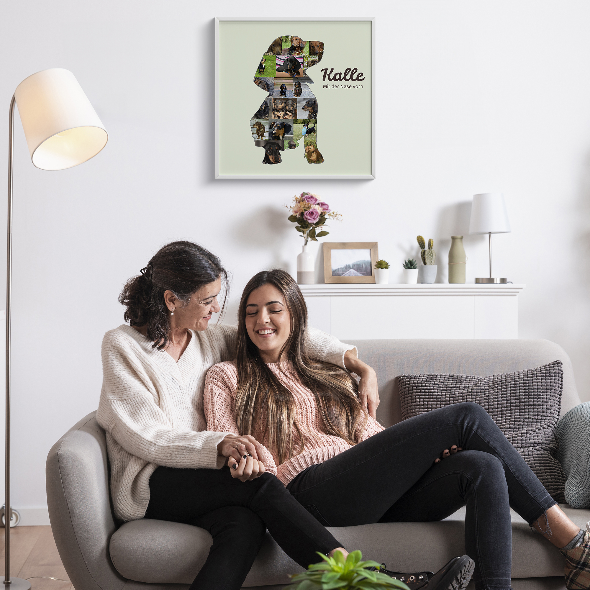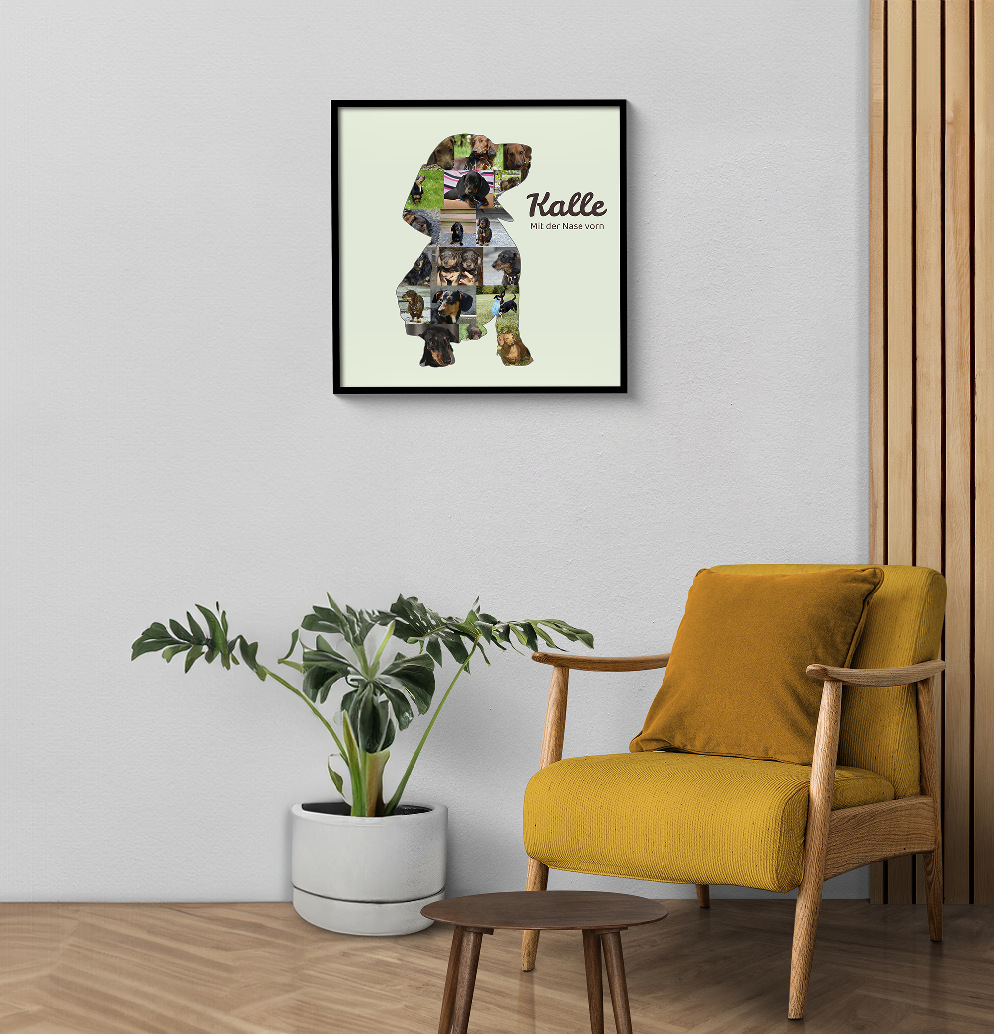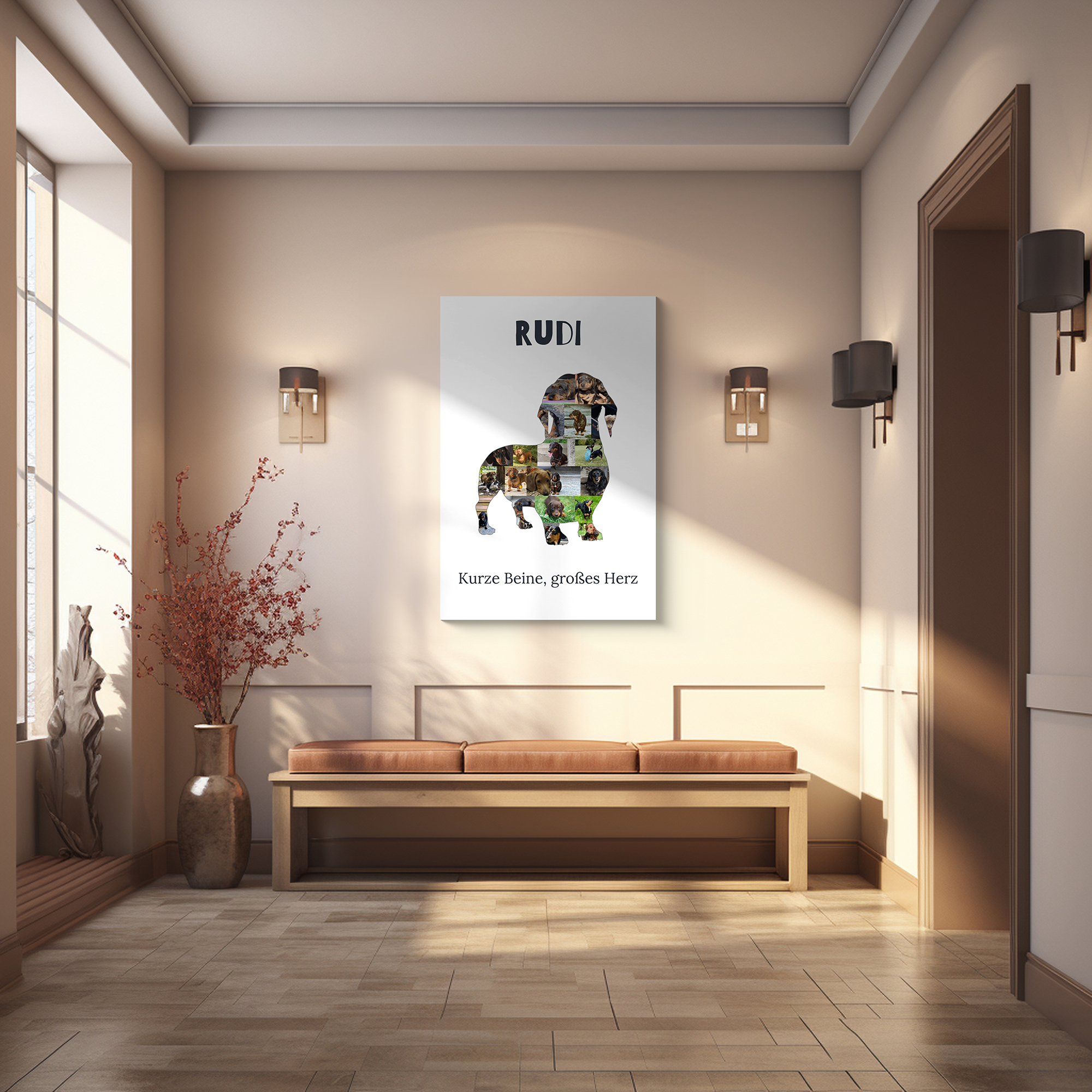 Gestalte jetzt deine Dackel-Fotocollage mit euren persönlichen Fotos! Ein idealer Weg, Erinnerungen an deinen vierbeinigen Freund zu bewahren und deinen Wohnraum zu verschönern. Treue Begleiter, charakterstarke Gesichter - platziere sie alle in der Silhouette deines Dackels.