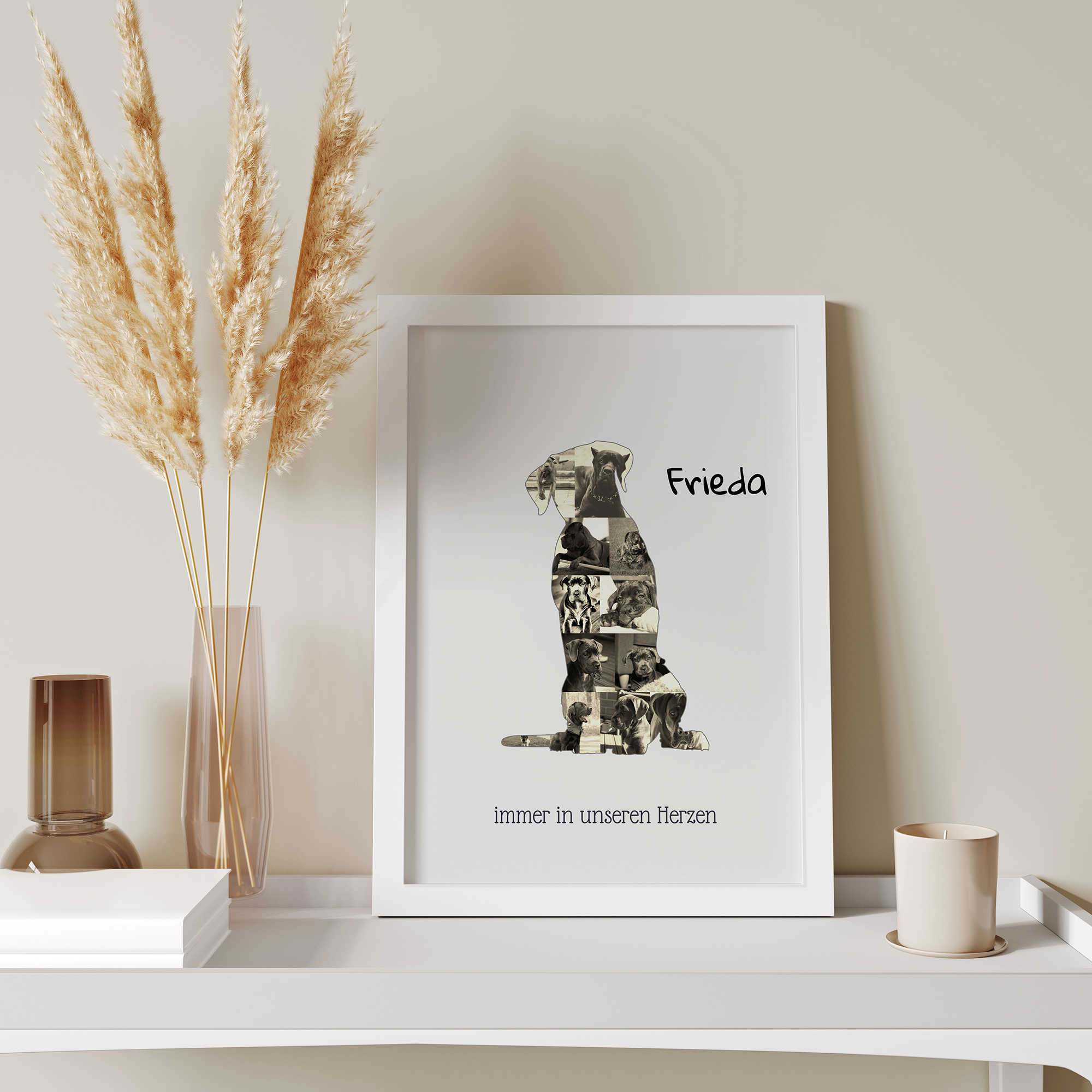 Gestalte Deine persönliche Cane Corso Fotocollage! Kreiere aus 15-20 Deiner liebsten Fotos Deine individuelle Collage im Silhouetten-Design Deines Cane Corso. Ergänze eine persönliche Botschaft und zaubere ein einzigartiges Kunstwerk.