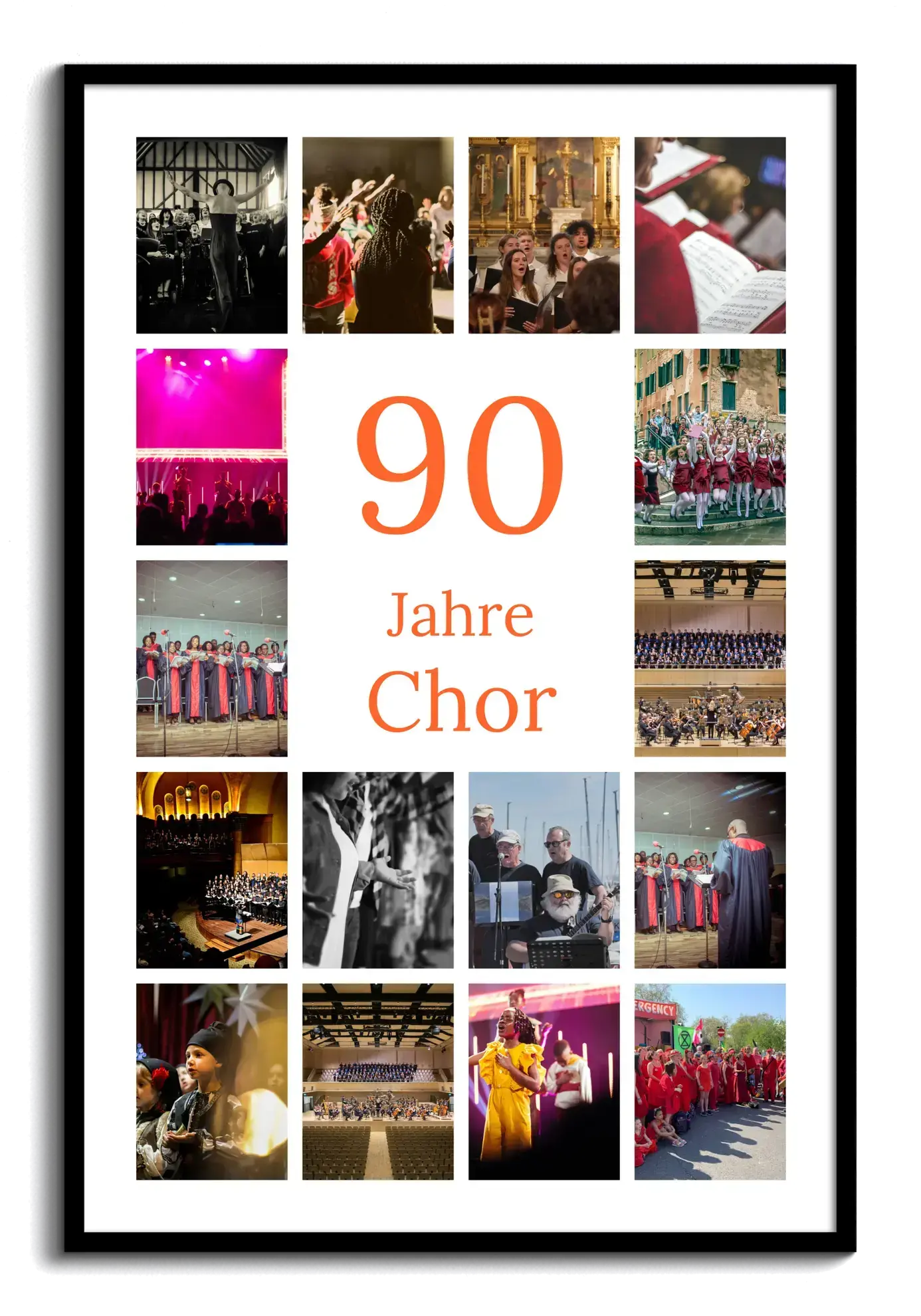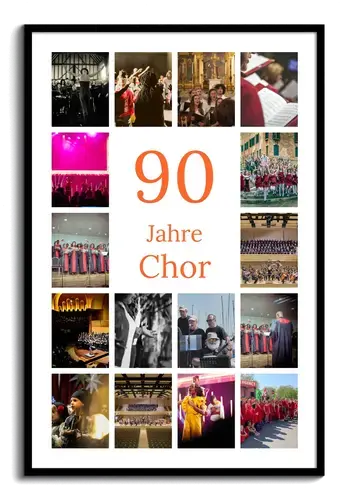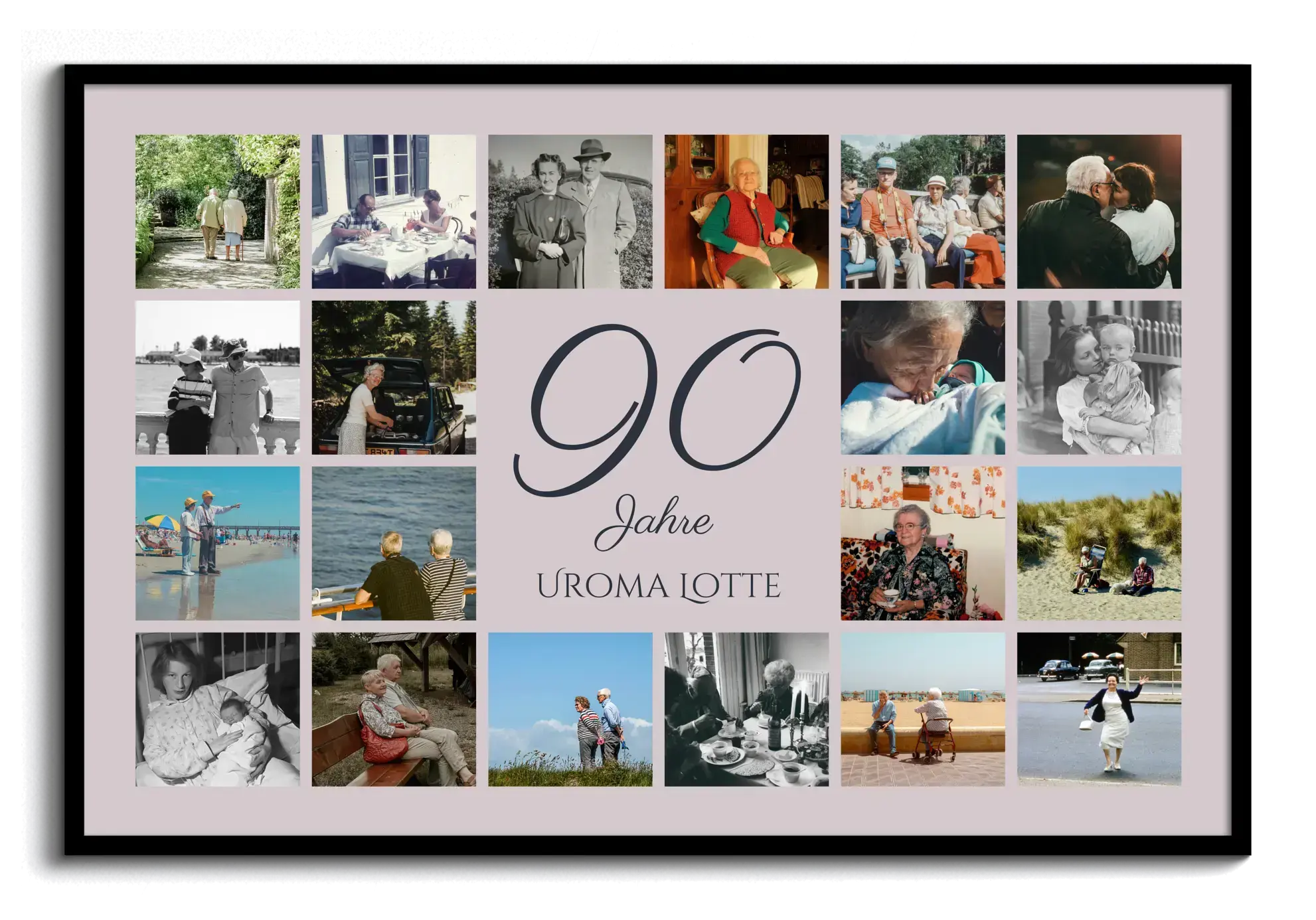 Collage 90: Zahl im Zentrum, Name/Gruß, 20–80 Fotos. Für 90. Geburtstag, Firmen-/Vereinsjubiläum.