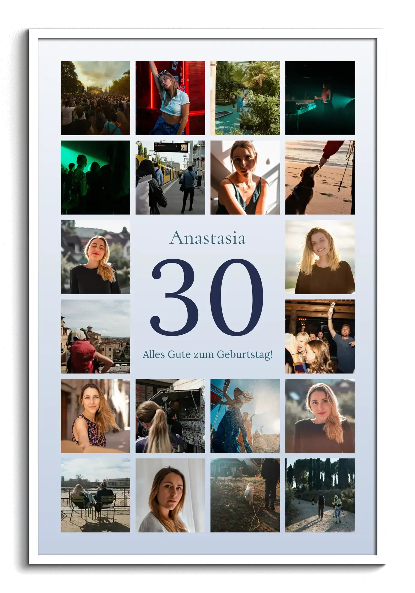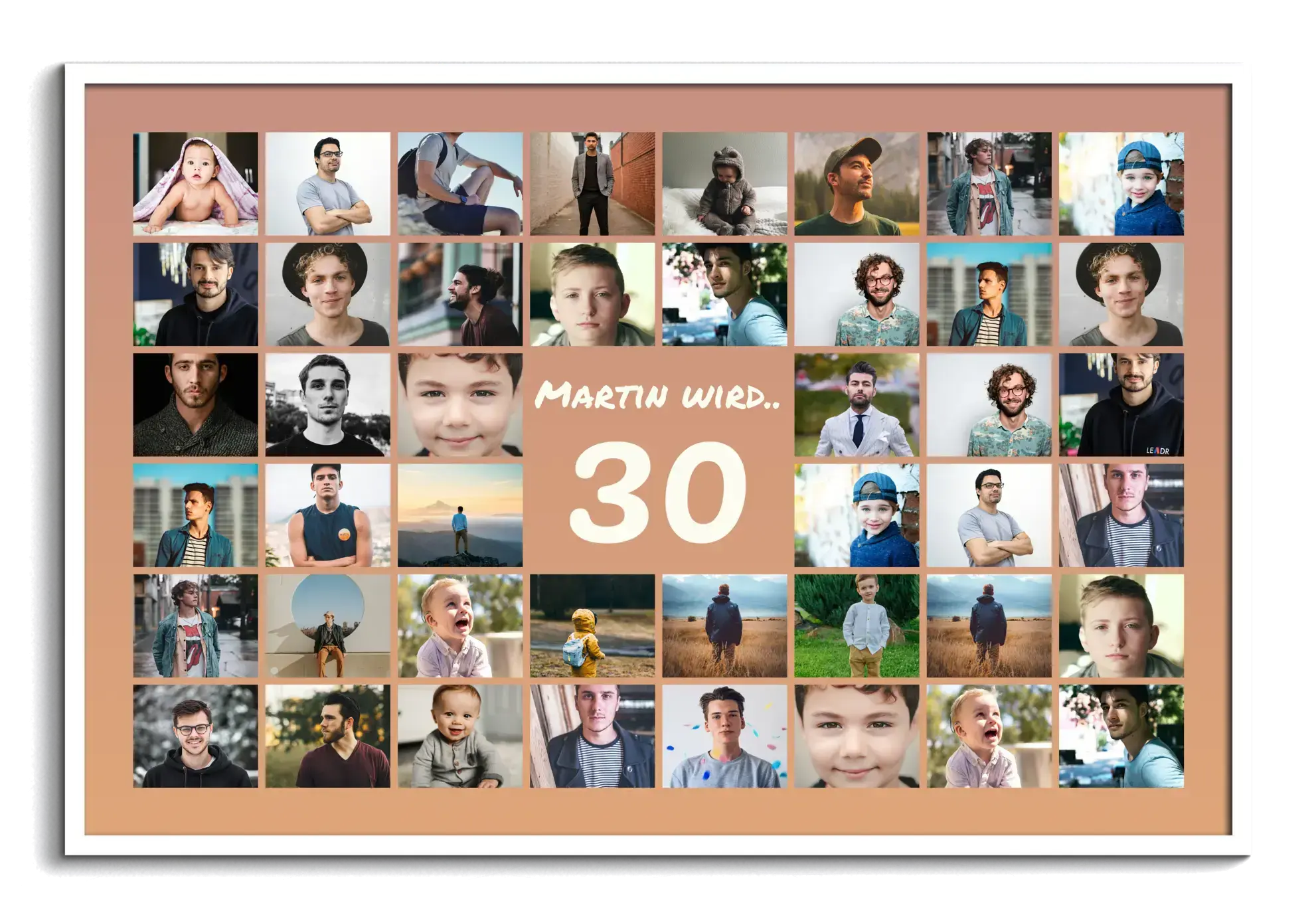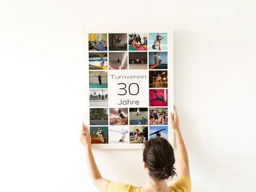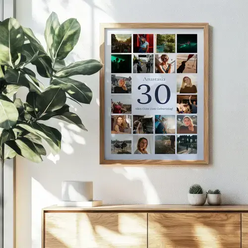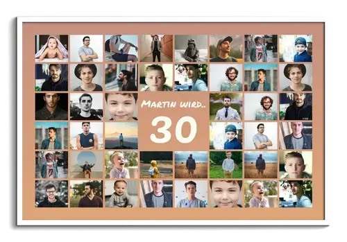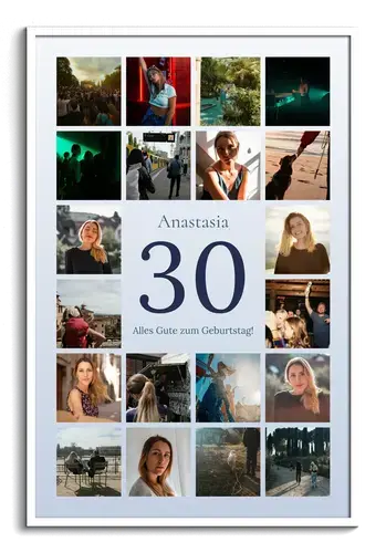 Die Jubiläums-Zahl Collage 30 zeigt eine große 30 im Zentrum, darüber den Namen, darunter deinen Gruß. Umrahmt von 20–80 Fotos im klaren Raster wird die Geschichte der letzten 30 Jahre sichtbar. Zahl, Name, Gruß, Bildanzahl, Hintergrund, Farben sowie Hoch- oder Querformat sind frei anpassbar – ideal für den 30. Geburtstag, 30 Jahre Liebe oder das 30-jährige Firmenjubiläum.