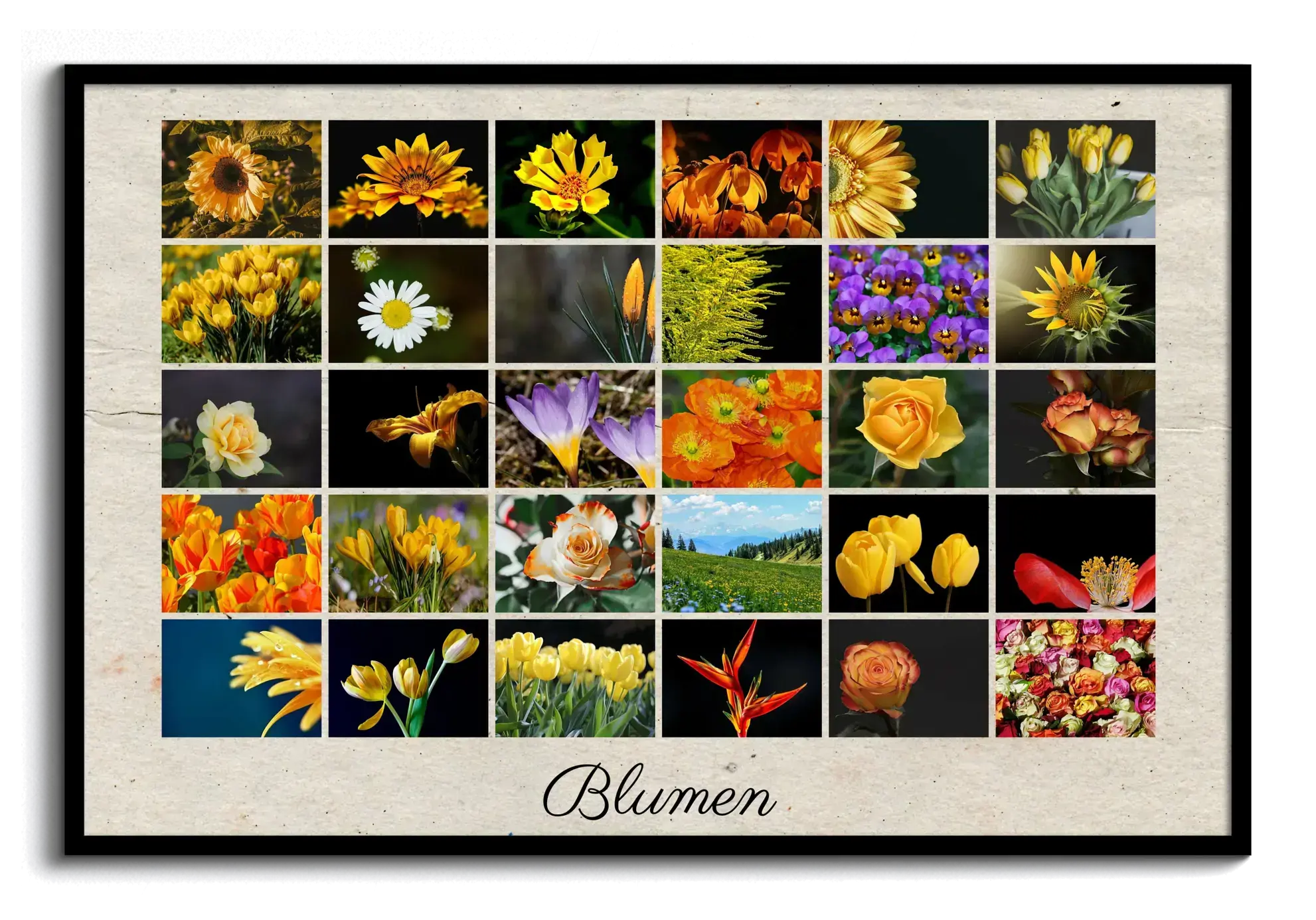 Gestalte jetzt deine Collage – direkt im Browser. Dieses Beispiel zeigt eine Postercollage im klassischen Raster-Design, gefüllt mit Blumenbildern; unterhalb ergänzt ein Text: Blumen. Alle Fotos und der Titel sind frei austauschbar. So wird aus dem Muster ein elegantes Deko-Highlight oder ein persönliches Geschenk.