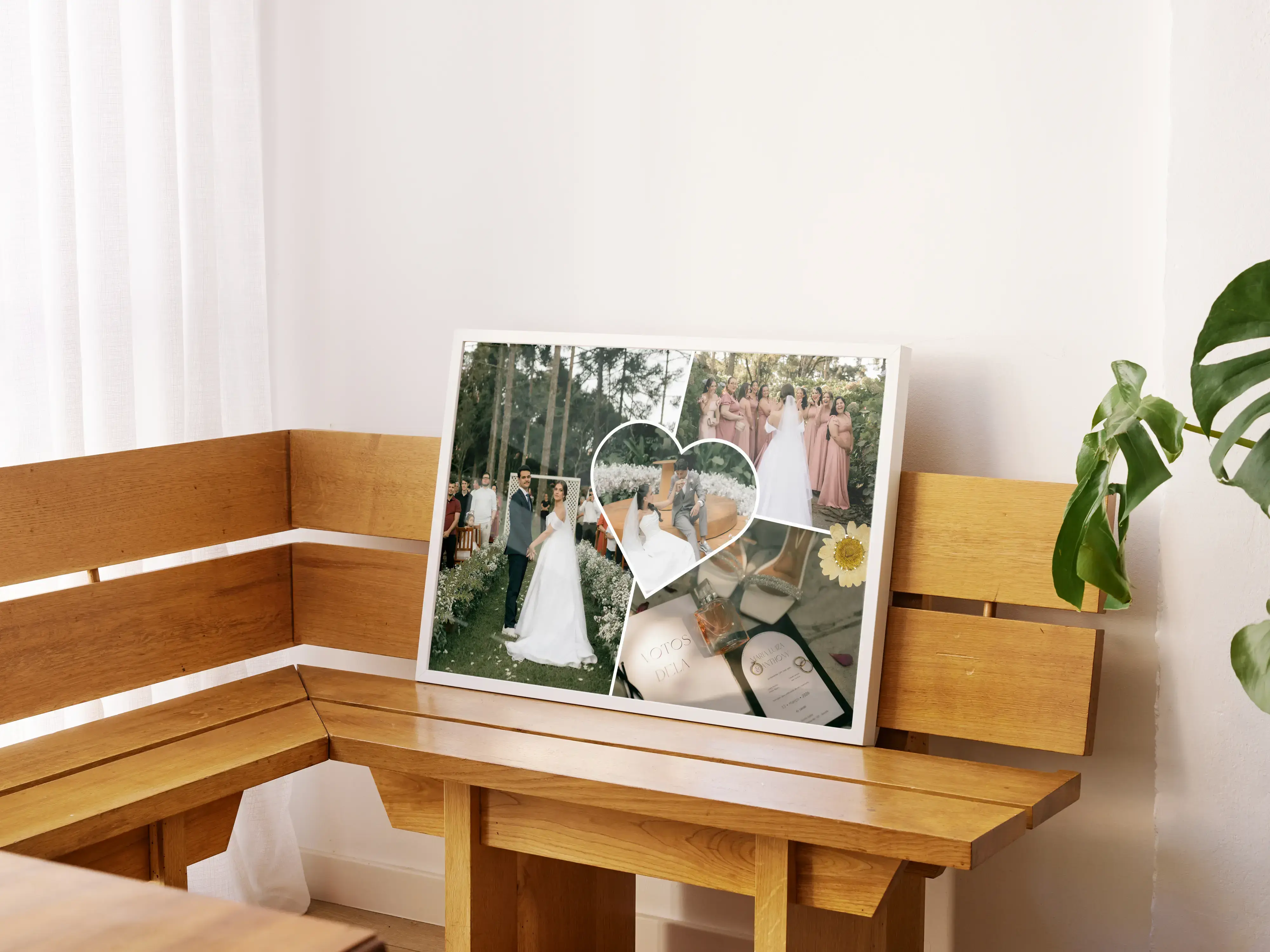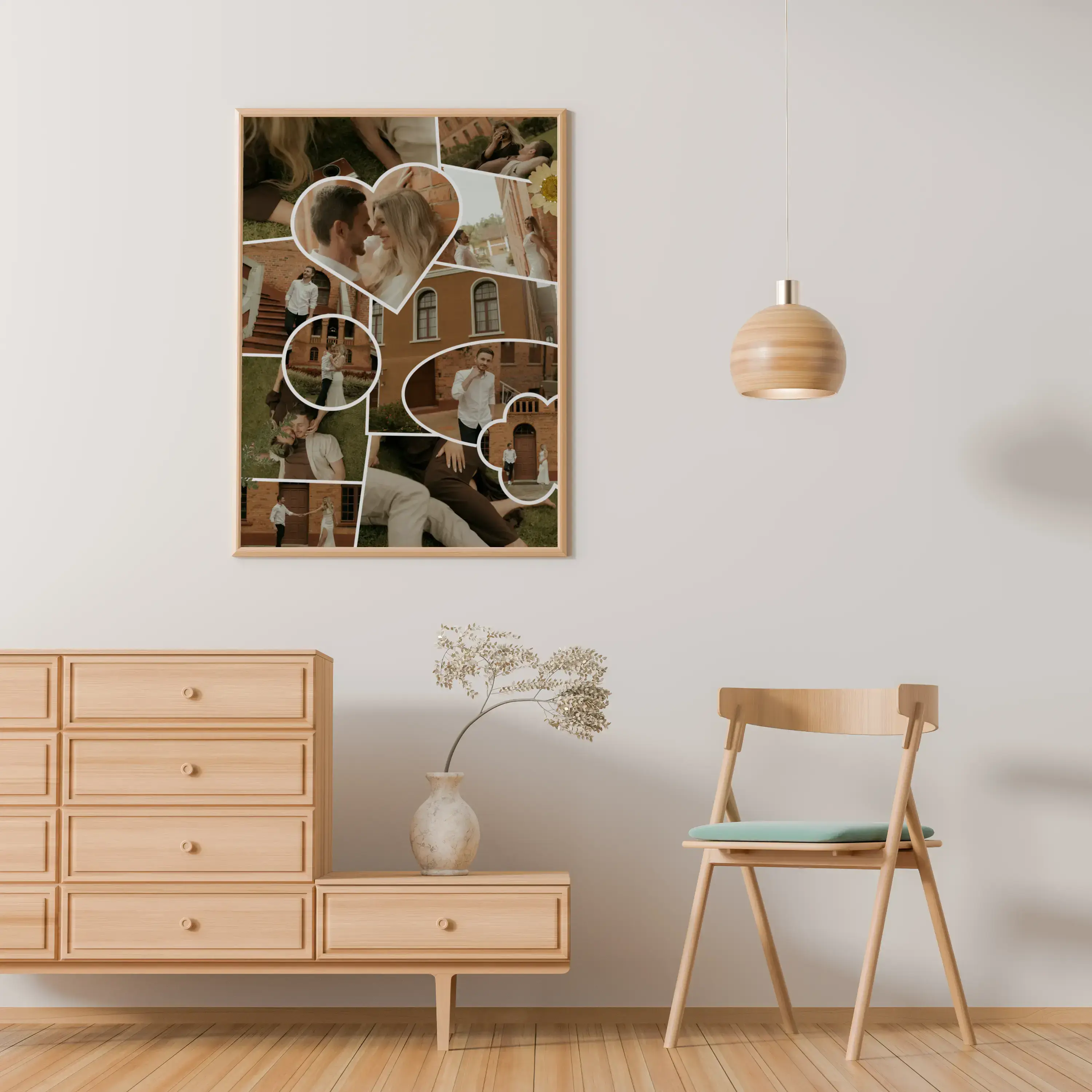Bei der Gestaltung bleibst du flexibel: Du kannst zwischen Hochformat und Querformat wählen, die Größe passend zum Raum bestimmen und die Bilder so platzieren, dass die Gesamtwirkung ruhig, harmonisch und persönlich wird. Gerade bei dieser cleanen Scrapbook-Vorlage kommen Hochzeitsfotos, Verlobungsbilder oder emotionale Paarmomente besonders stilvoll zur Geltung. Auch die Anzahl der Bilder lässt sich an deine Auswahl anpassen.