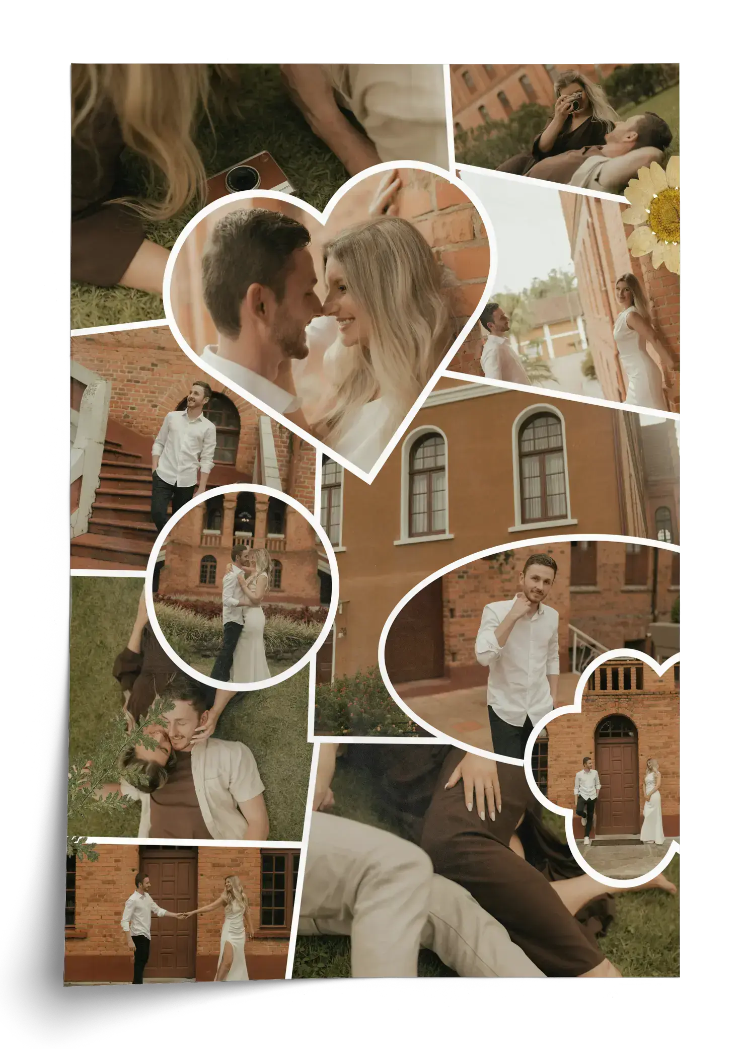 Gestalte jetzt deine persönliche Scrapbook-Collage im cleanen Stil zur Hochzeit oder Verlobung. Mehrere Fotos wirken wie locker auf einer Seite ausgelegt, dezent ergänzt durch wenige feine Scrapbook-Elemente. Ohne Text bleibt der Fokus ganz auf euren Momenten, wahlweise im Hochformat oder Querformat.