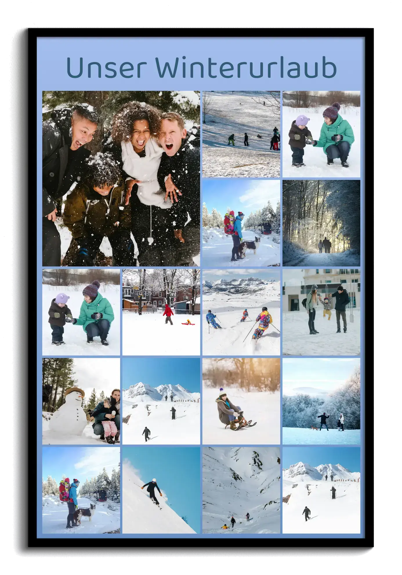 Erstelle deine persönliche Winter-Collage und halte die unvergesslichen Momente deines letzten Winterurlaubs fest. Ob Skifahren, Schneeballschlachten oder gemütliche Abende am Kamin – lass deine Lieblingsfotos von Landschaften und der Familie zu einer einzigartigen Erinnerung werden. Individuelle Texte wie "Unser Winterurlaub" geben deiner Collage den finalen persönlichen Touch.