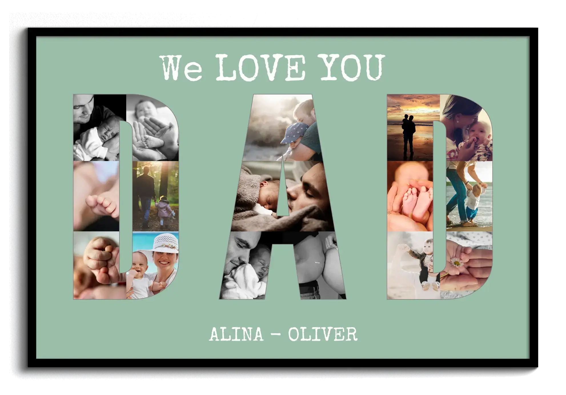 Créez une magnifique déclaration d'amour pour votre père avec notre collage photo personnalisable "We LOVE YOU DAD". Chaque lettre du mot "DAD" est composée de vos photos spéciales, accompagnée de l'inscription "We LOVE YOU" au-dessus et des prénoms des enfants en dessous. Un cadeau parfait pour la fête des pères ou pour célébrer votre papa à tout moment. Personnalisez les textes et les prénoms selon vos envies.