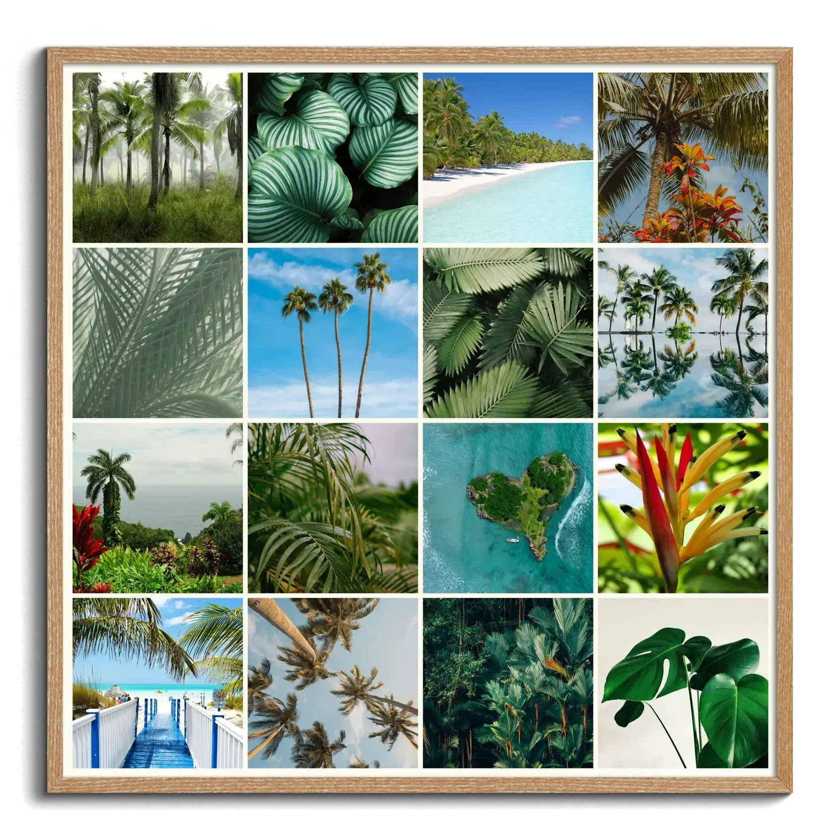 Crée maintenant ta composition Nature premium. Ce modèle met à l’honneur plantes et fleurs: feuillages tropicaux, palmiers au soleil, ambiances de forêt humide, tropiques et plage. Assemble tes photos préférées dans des mises en page variées et fais-les imprimer en qualité haut de gamme, lumineuse et durable.
