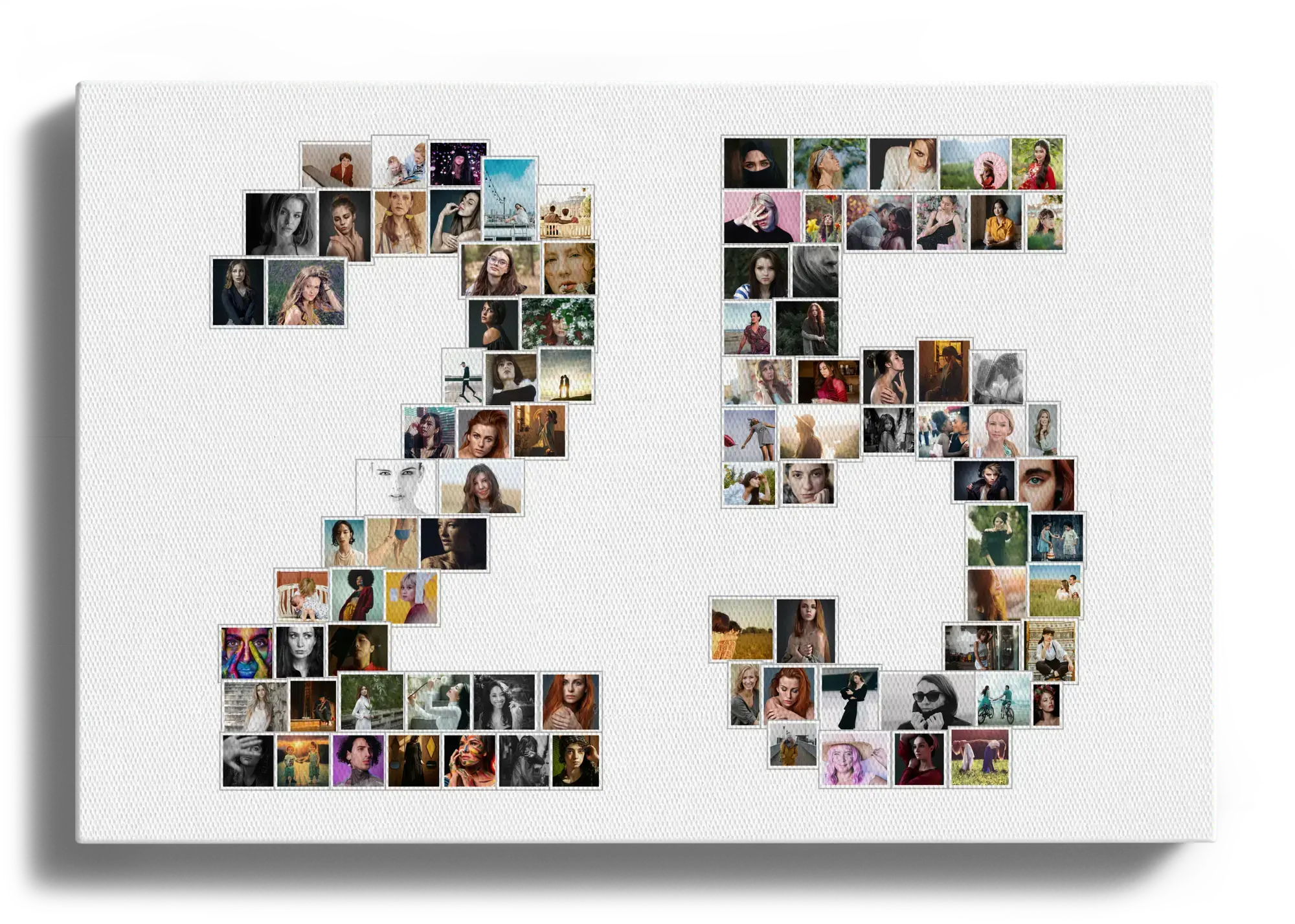 Créez votre propre collage photo personnalisé en un clin d'œil. Imaginez un collage unique, où le chiffre '25' est composé de vos photos préférées. Utilisez entre 1 et 100 images pour former une composition parfaite. Parfait pour célébrer des occasions spéciales comme les noces d'argent ou un jubilé d'entreprise, tout en ajoutant une touche personnelle avec des photos, des citations, des couleurs de fond, des polices et un agencement modifiable selon vos goûts.
