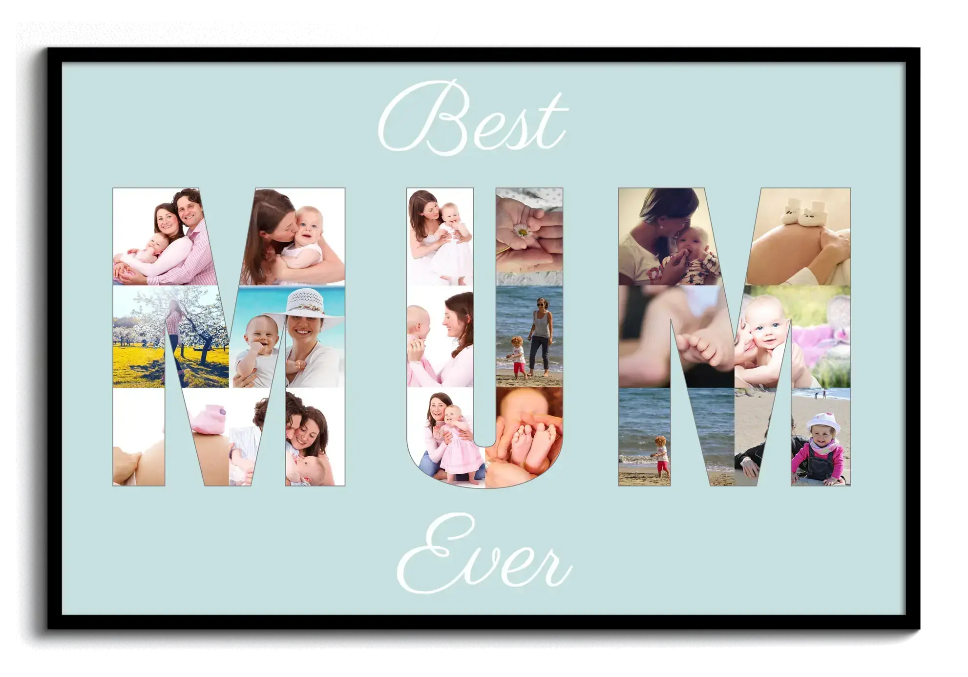 Créez une magnifique surprise personnalisée avec notre collage photo "Best Mum Ever". Composez les lettres de "MUM" avec vos propres photos chéries et encadrez-les entre "Best" en haut et "Ever" en bas. Personnalisez les textes pour faire de ce cadeau une déclaration sincère, idéale pour la fête des mères ou tout simplement pour célébrer une mère.