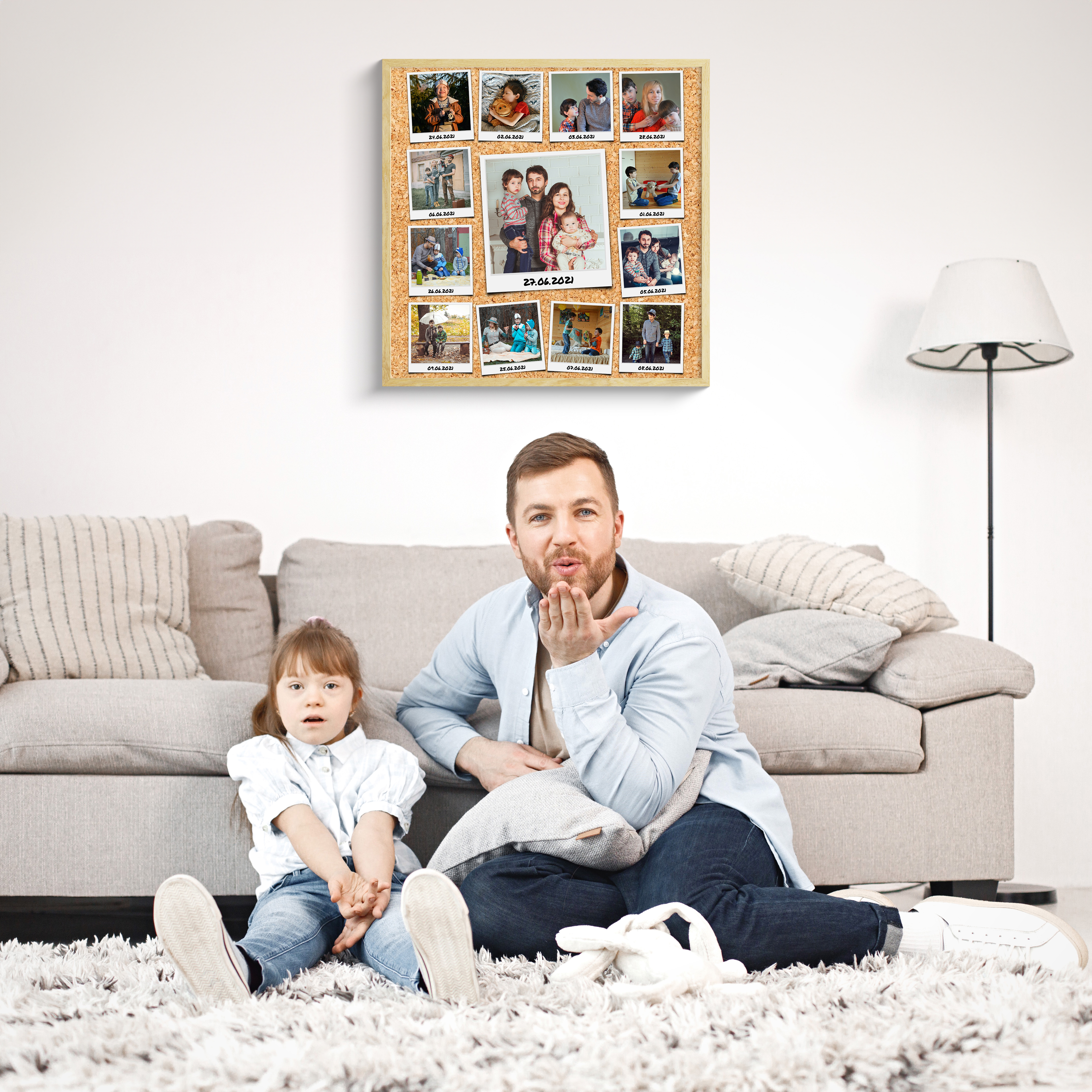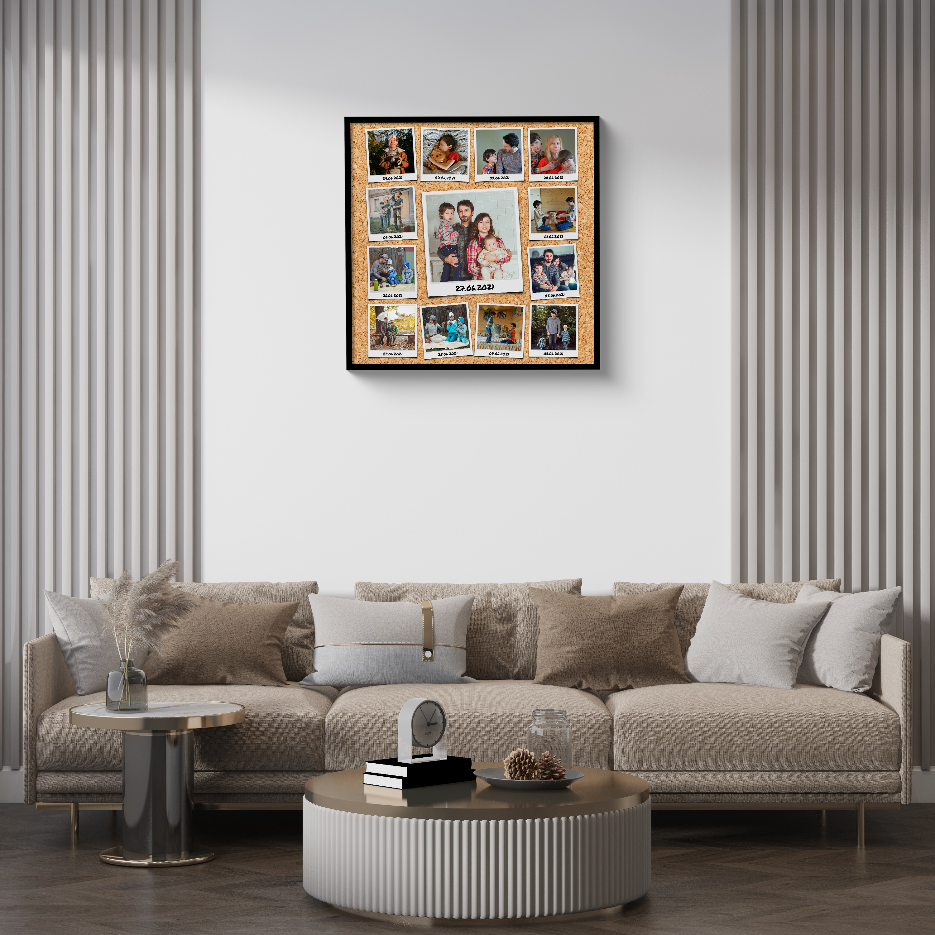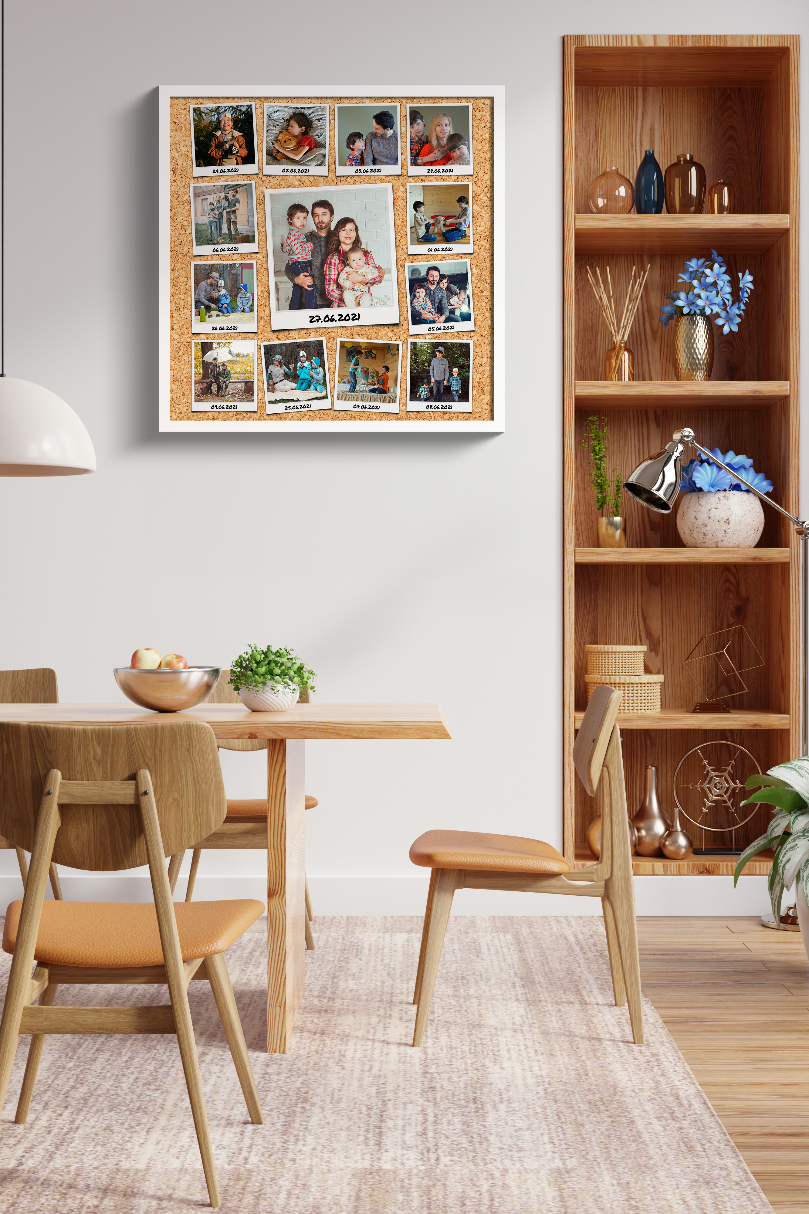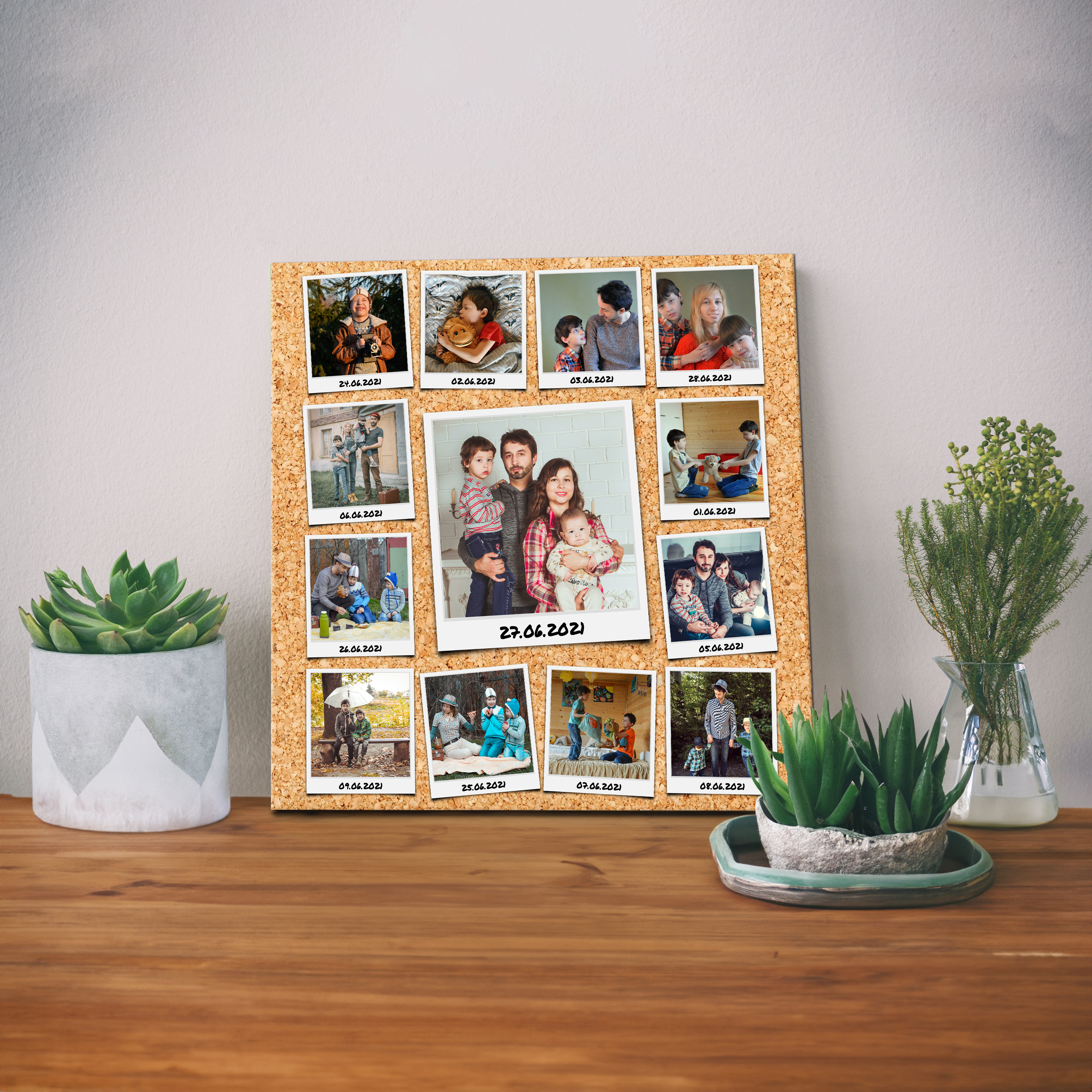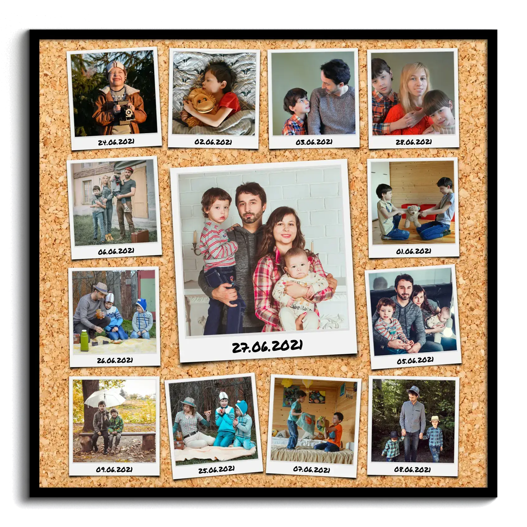 Créez dès maintenant votre propre collage photo stylée ! Personnalisez vos souvenirs avec une touche rétro grâce au design Polaroid, disponible en format carré, portrait ou paysage. Une grande photo en centre attire le regard, entourée de petits clichés. Choisissez un fond amusant comme un tableau de liège. Idéal pour des occasions spéciales telles que les anniversaires, baptêmes, mariages ou rentrées des classes. Modifiez aisément le nombre de photos, les textes et les arrière-plans selon vos envies.
