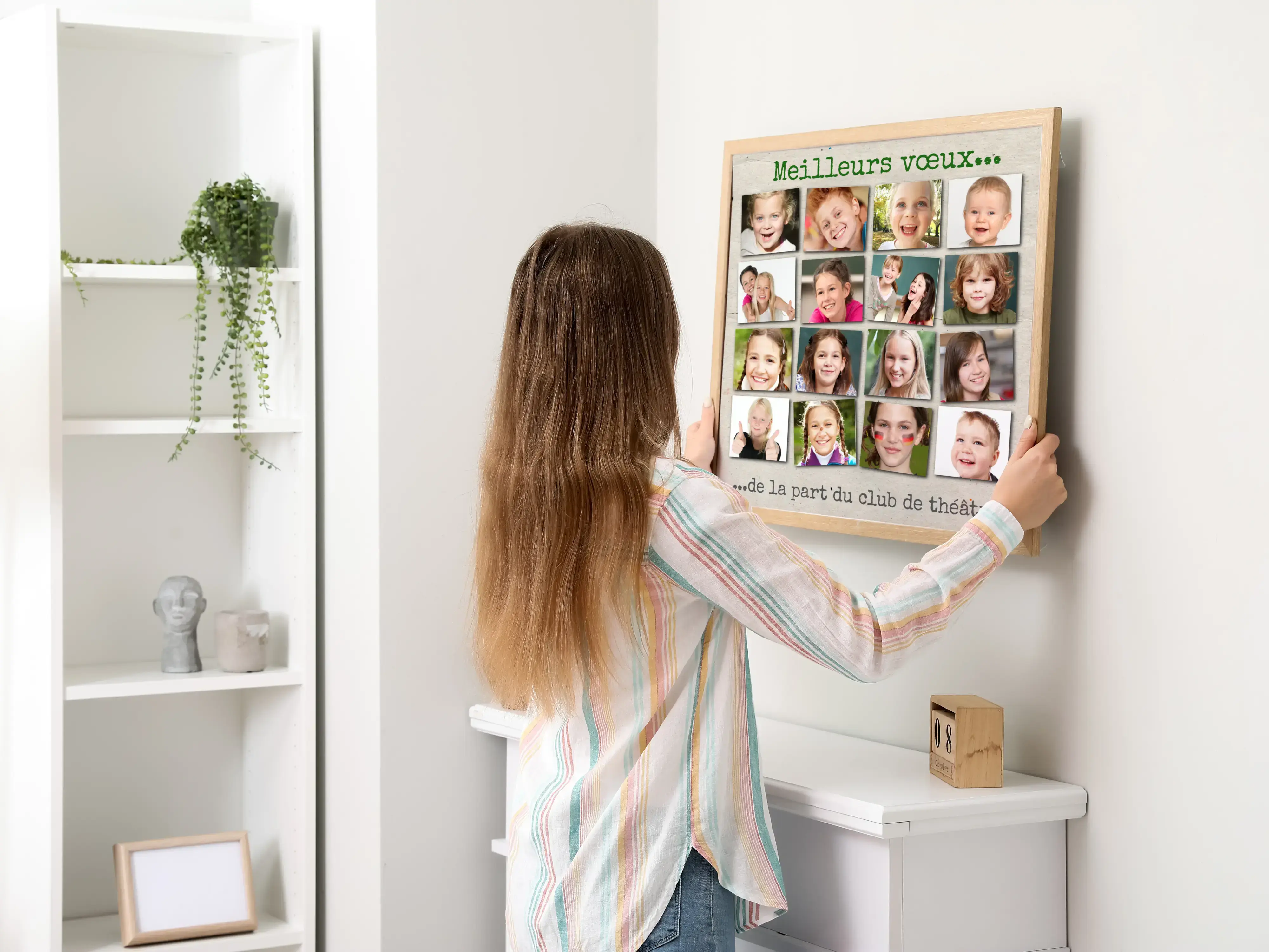 Créez votre propre collage photo unique et personnalisez-le selon vos envies ! Imaginez une création rassemblant les meilleurs moments de votre groupe scolaire, avec 16 photos d'élèves agencées en grille, accompagnées d'un message inspirant de votre choix : "Tout le meilleur de la part du club théâtre". Idéal à offrir à un enseignant, à exposer dans la salle d'activité ou à garder en souvenir pour les enfants et les parents. Chaque élément, des images aux couleurs et au texte, peut être personnalisé.