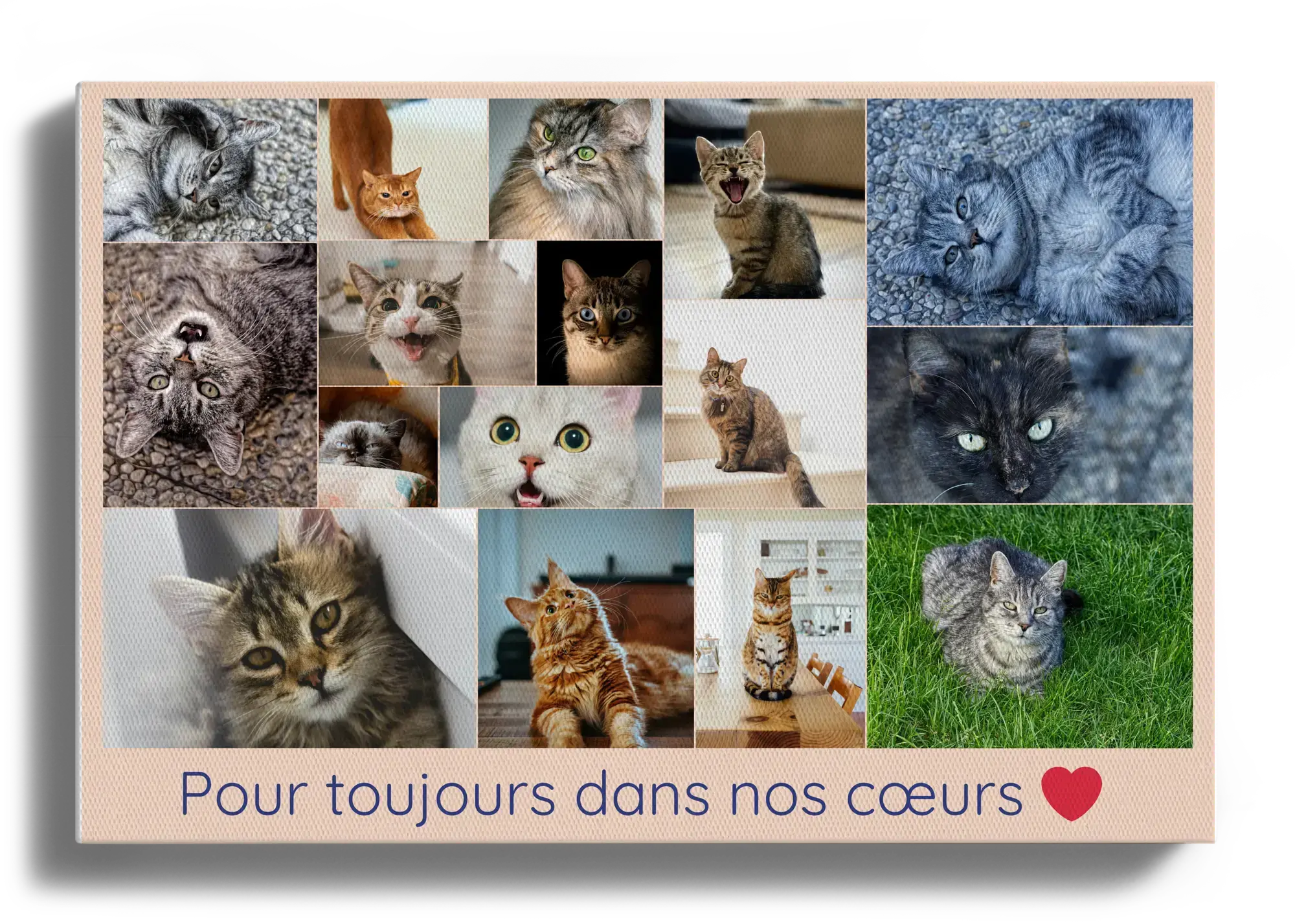 Créez un collage hommage chat: photos + textes personnalisés (nom, dates)