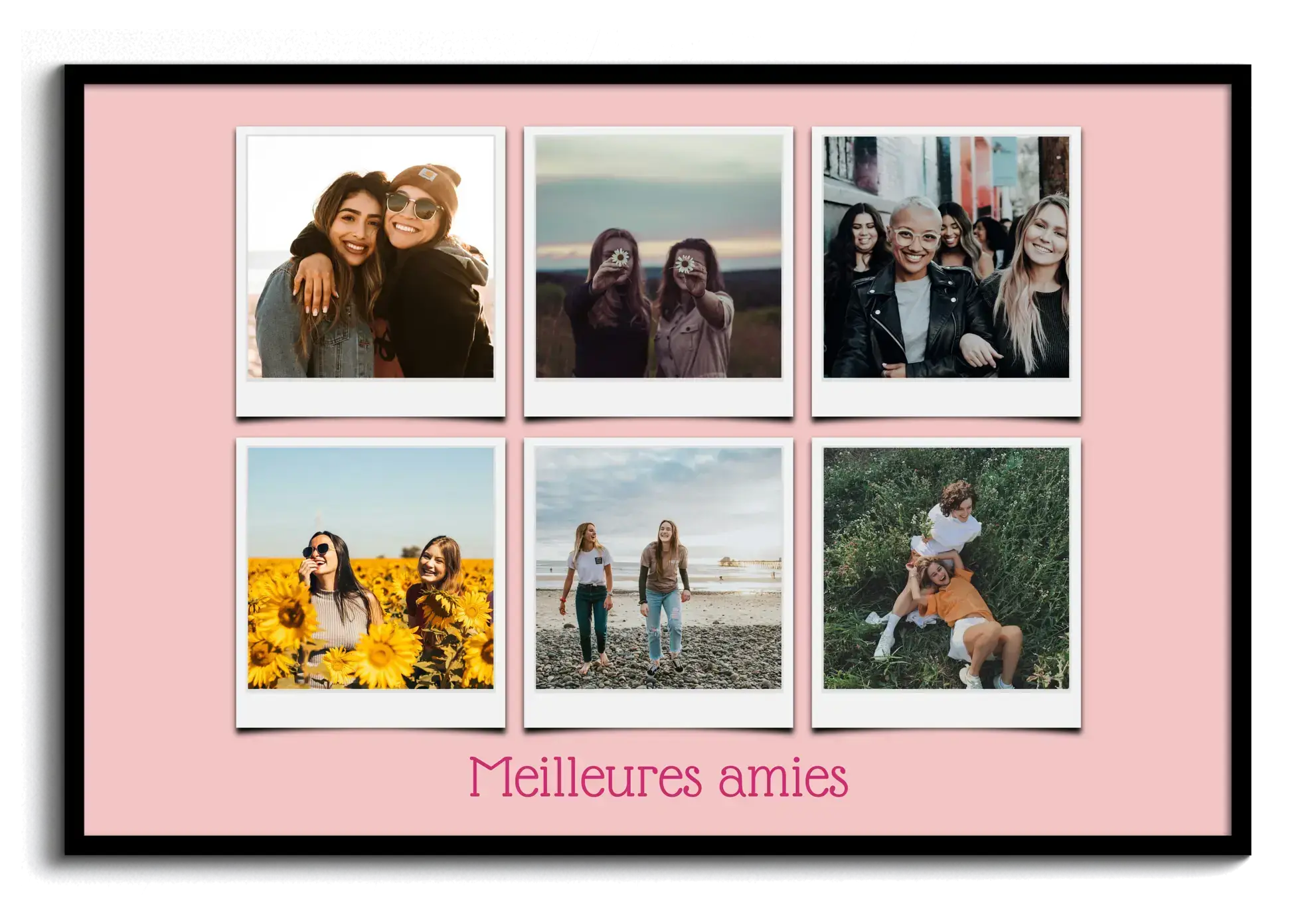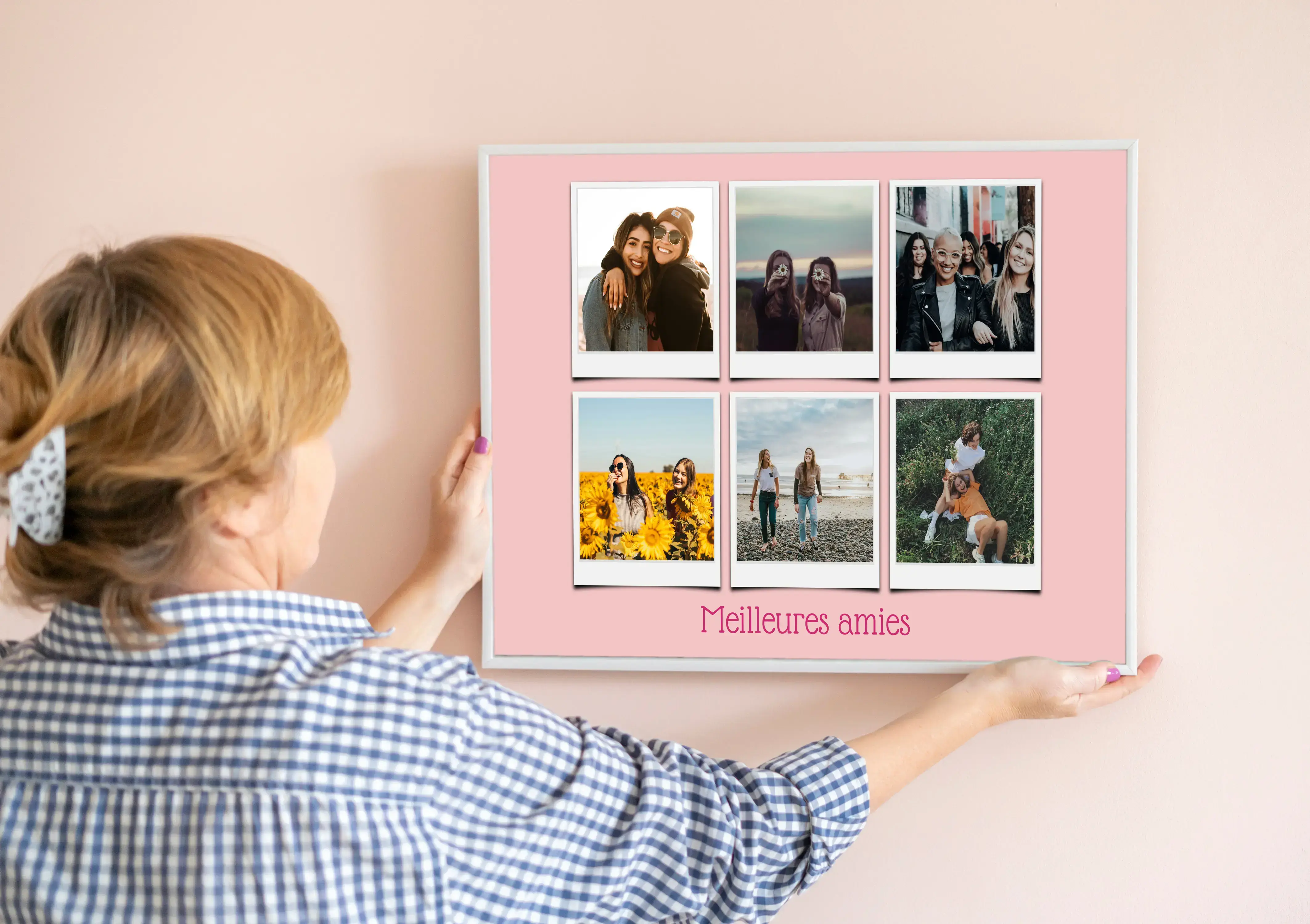 Créez votre propre chef-d'œuvre avec notre produit de collage photo personnalisable. Imaginez une mosaïque de souvenirs avec des photos de vos amis, disposées dans un style Polaroid, accompagnées de textes personnalisés tels que "Meilleures amies". Choisissez, ajustez et amusez-vous à capturer ces instants précieux de manière unique.
